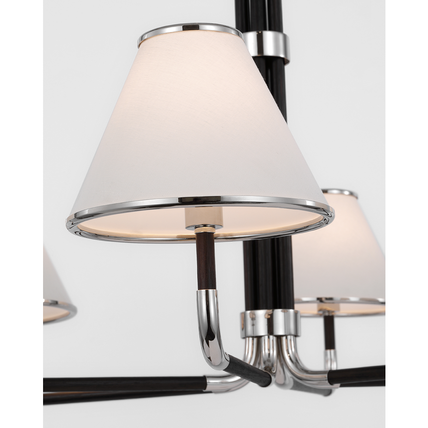 The Rigby series by Marie Flanigan showcases a linear design with elegant, contemporary refinement. The sconce, floor lamp, and various styles of chandeliers are all accented with unexpected natural oak with brass or ebony with polished nickel. All profiles feature single or multiple trimmed linen shades and will serve as novel conversation pieces for any space in the home.