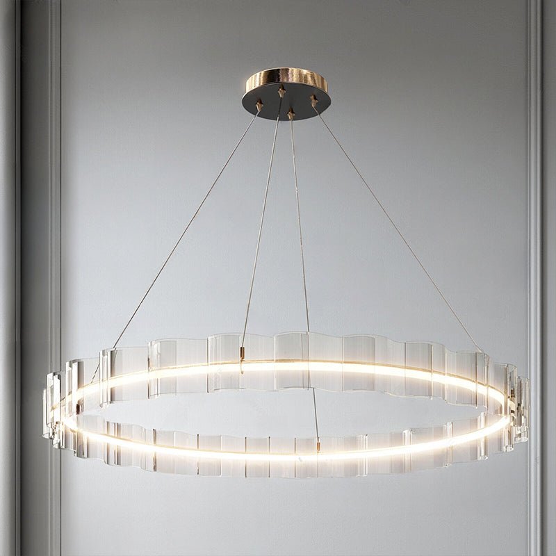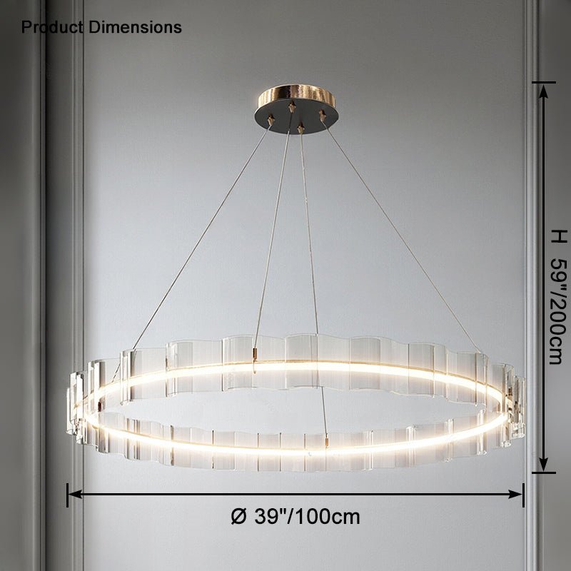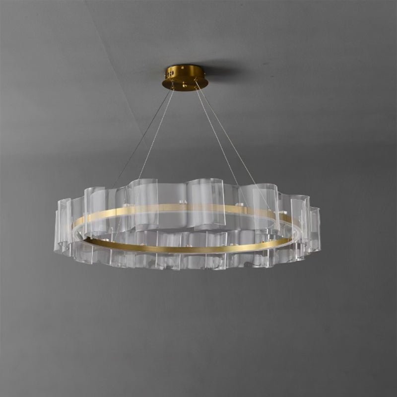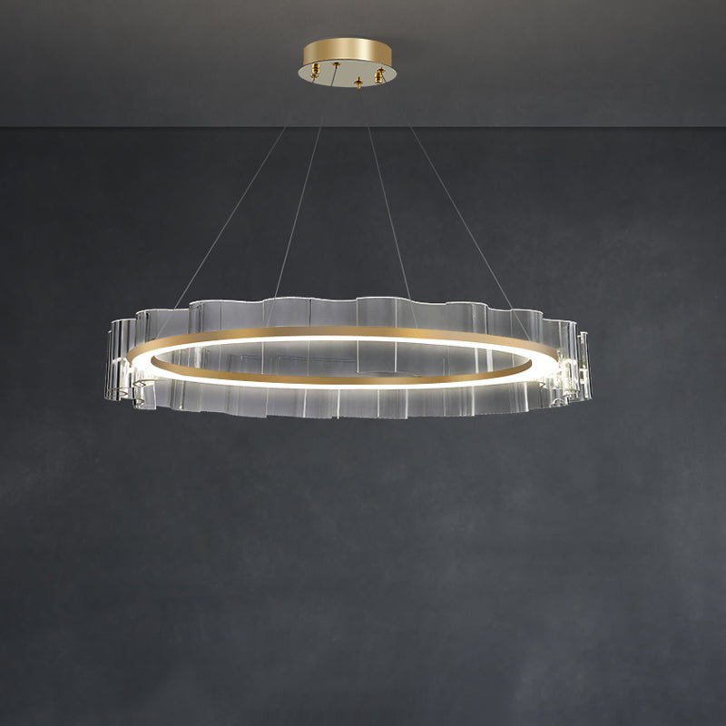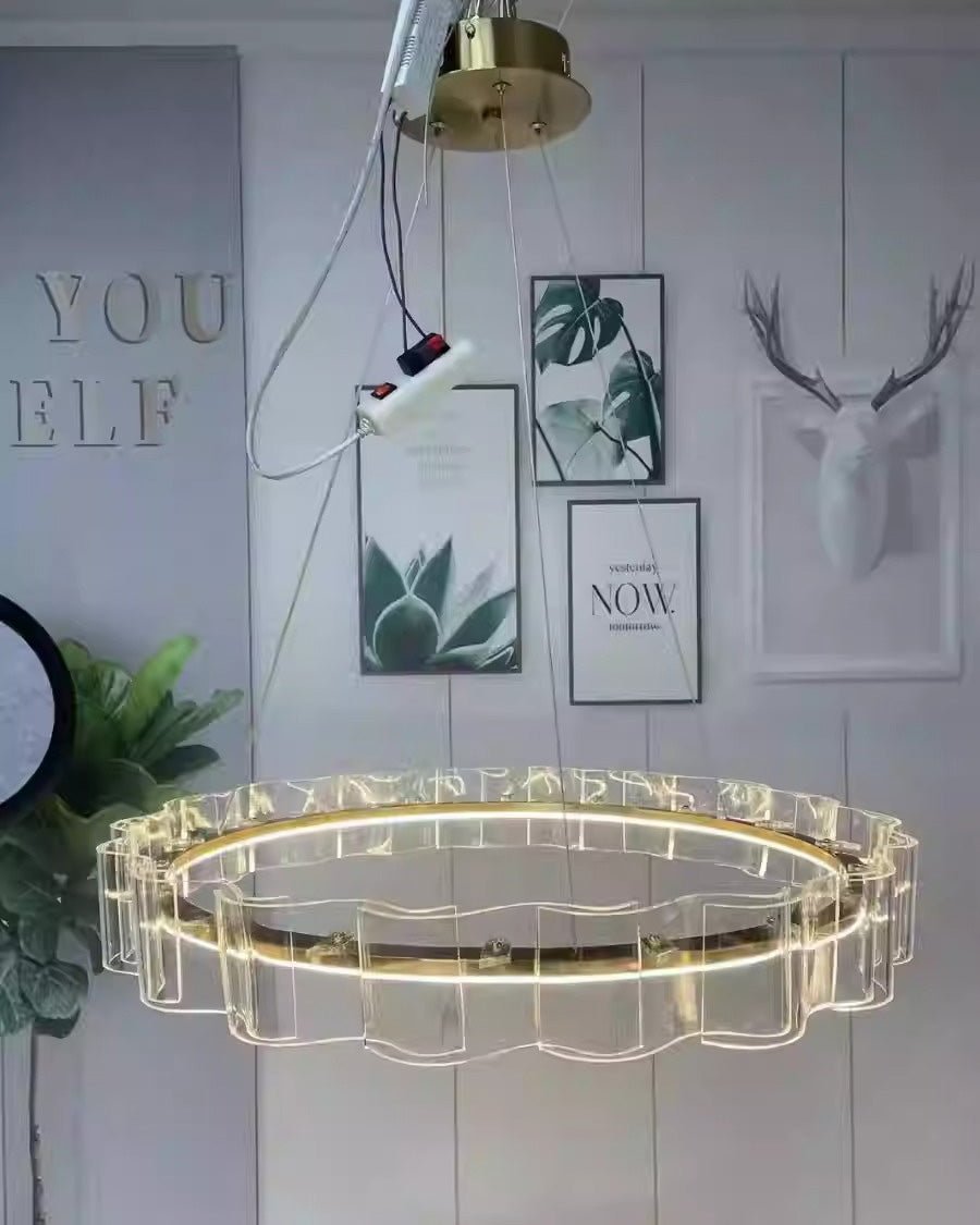 Illuminate your dining room with the stunning jucci Acrylic Ring Led Chandelier-WM2604. The elegant acrylic wave design and circular LED lights add a touch of luxury to any space. Finished in gold, this chandelier is sure to create a warm and inviting ambiance. Upgrade your home decor with this must-have statement piece.