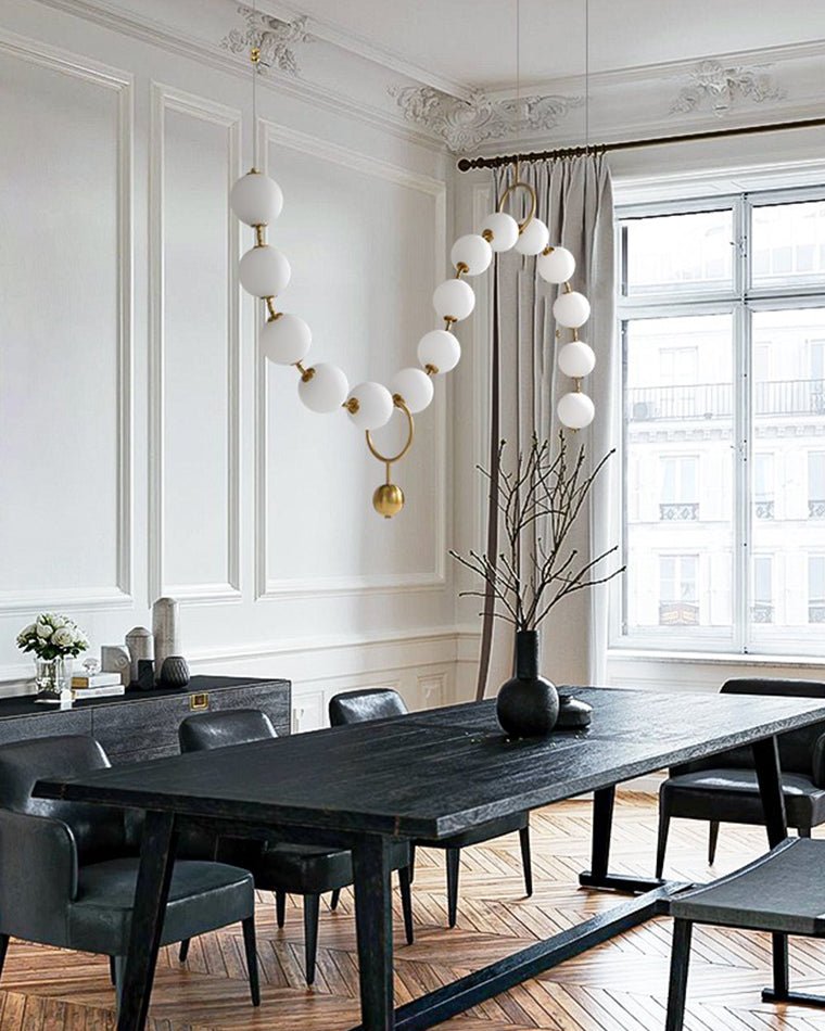 Experience the glamour of Art Deco with the jucci Adjustable Pearl Chandelier-WM2936. The gold frame and shimmering acrylic pearls create a stunning globe design, perfect for adding luxury to any dining room. With its adjustable height, this chandelier offers both elegance and functionality.