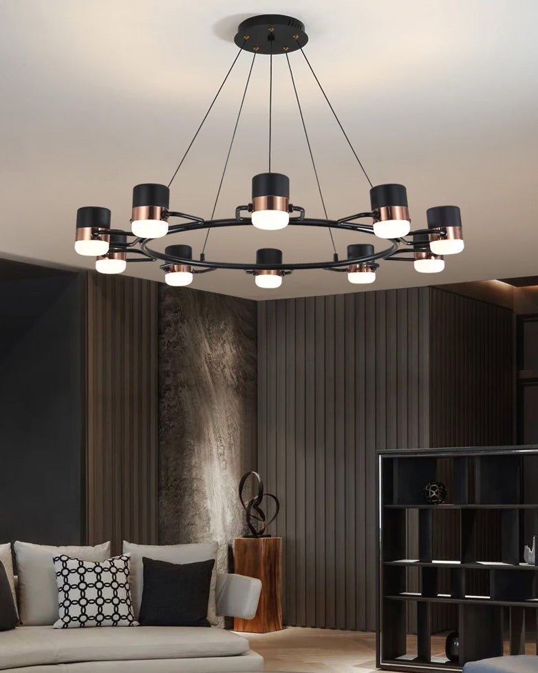 Introducing the effortlessly elegant jucci Adjustable Rose Gold Round Chandelier-WM2645. This contemporary chandelier features an adjustable design, allowing you to customize the lighting for any occasion. The beautiful rose gold and black finish adds a touch of sophistication to any living room or dining room. Bring modern style and versatility to your space with this stunning chandelier.