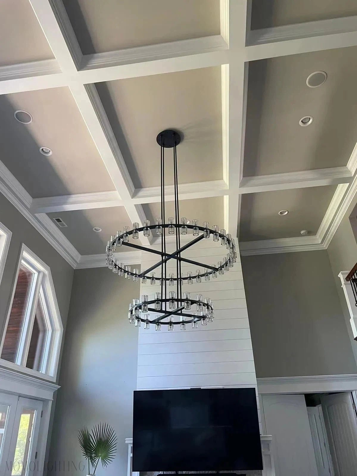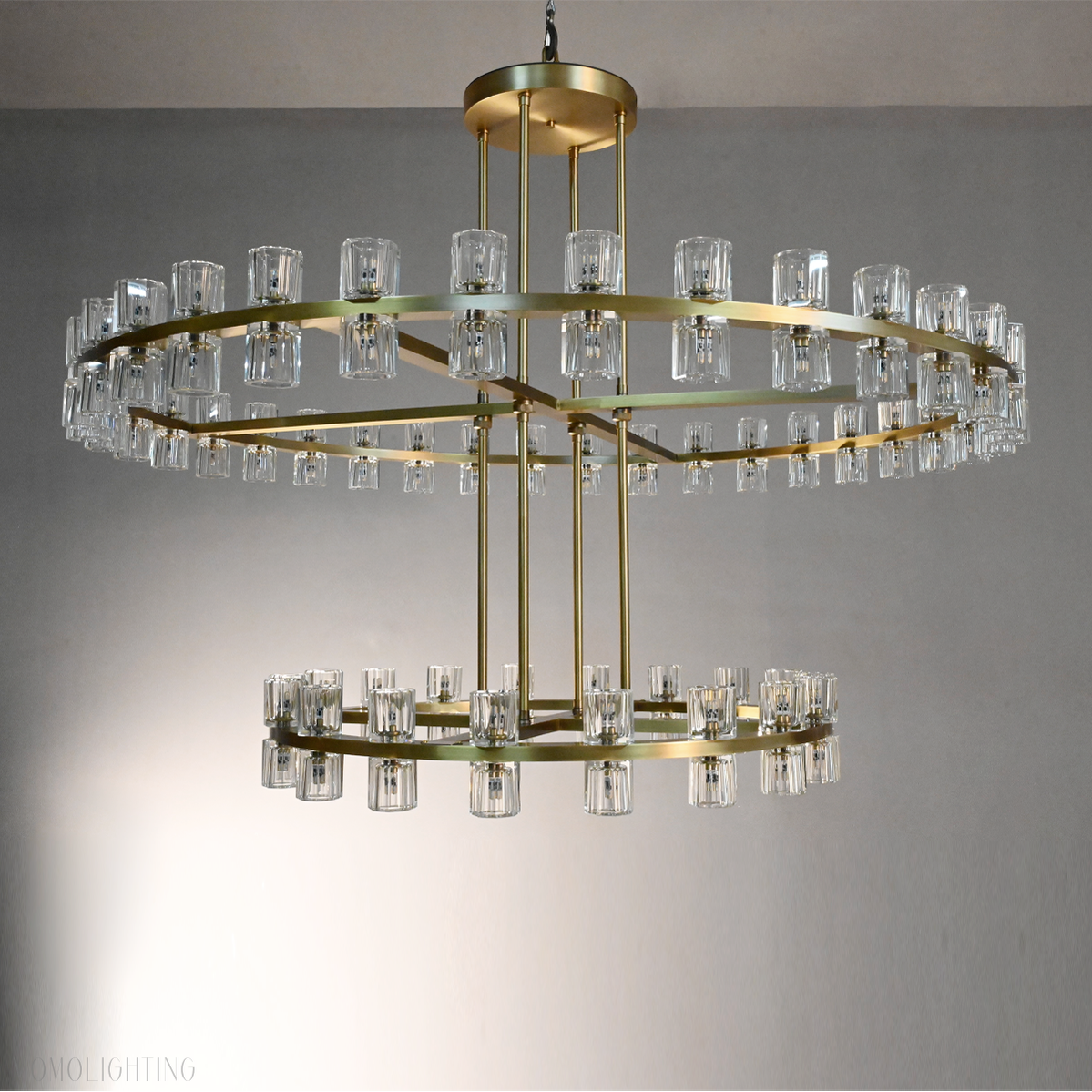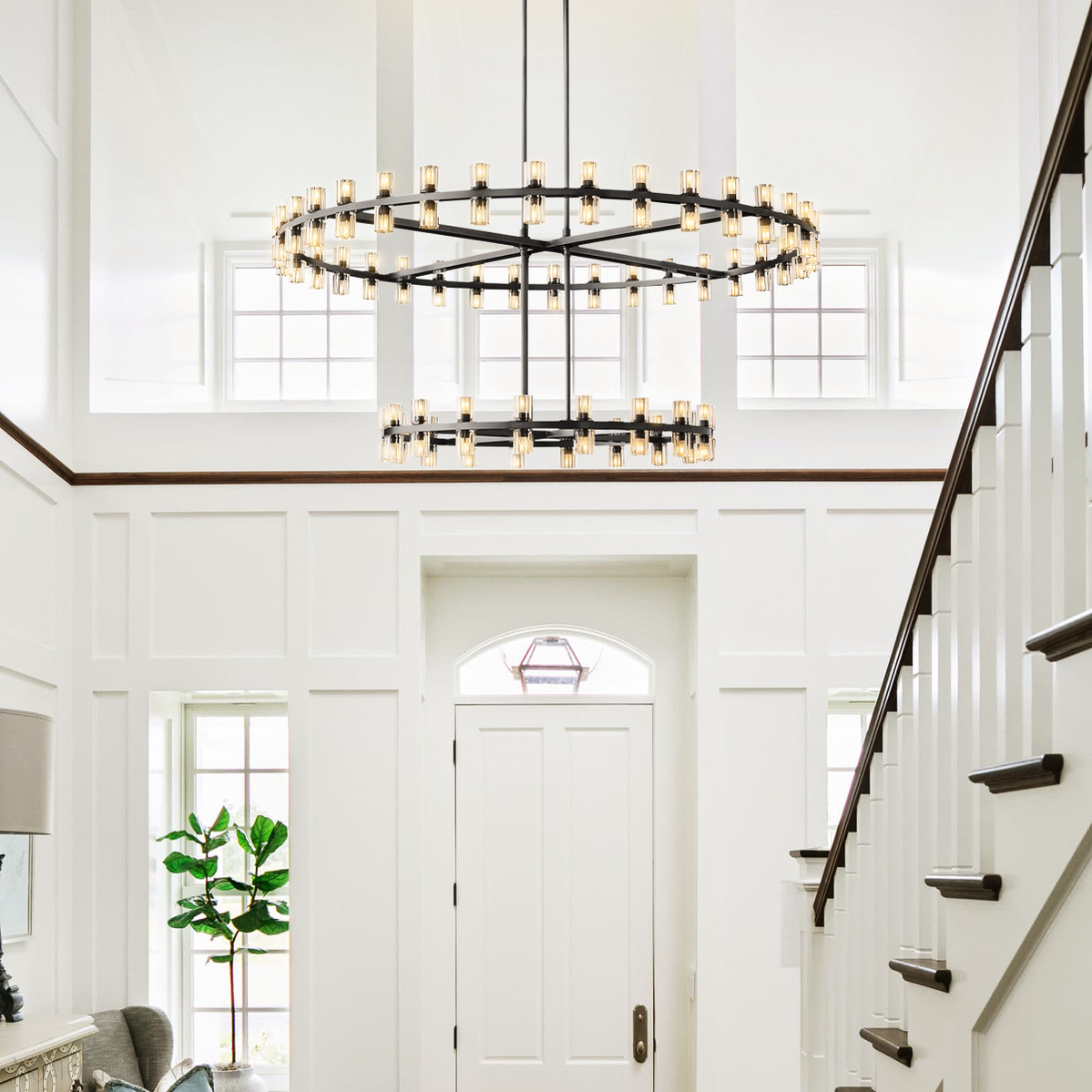 Chandelier Body: 60″ diam., 22″HTop Tier: 60″ diam., 6″HBottom Tier: 36″ diam., 6″HMinimum Height: 60″Maximum Height: 156″Canopy: 4½” diam., ¾”HRods: eight 6″, sixteen 12″, eight 18″Weight: 112 lbs.