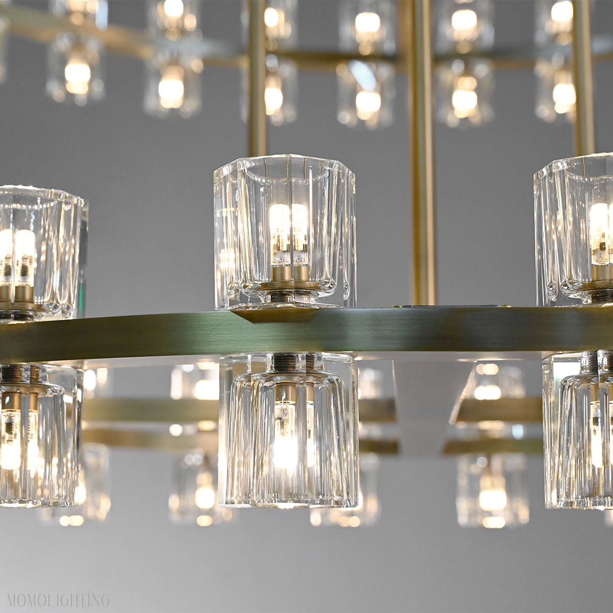 The rhythmic design of this chandelier collection is inspired by the shape and scale of industrial gears, where spokes are interlaced with negative space to interlock with other gears. Here, the spokes are hexagonal in form, juxtaposed with a circular interior, crafted from crystal glass, running along a simple, sturdy metal frame. The light shines through the glass as if it were a candle.