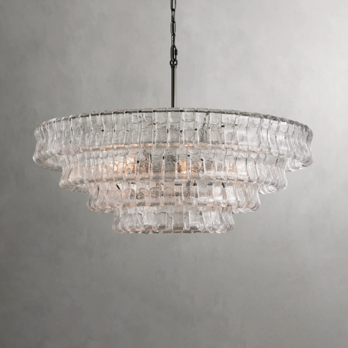 Inspired by Italy’s famous decorative glass, the Ghiaccio chandelier cleverly diffuses light through curved pieces of textured glass. With its copper-plated finish, Ghiaccio elegantly brightens any room.