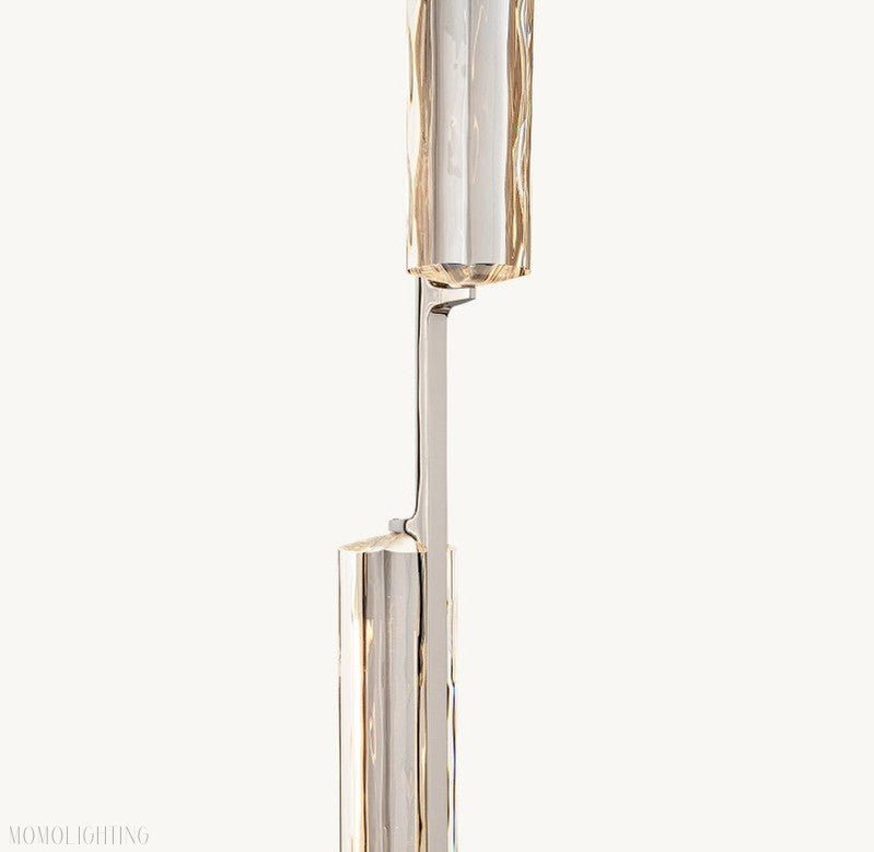 | Capturing the spirit of 1960s Italian minimalism, Audon appears to cascade from above with ten prisms of hand-polished K9 crystal on vertical brass drops. At once striking and restrained, the collection is the warmth of candlelight with elongated LEDs that shed beautiful light through the undulating texture of the glass. |