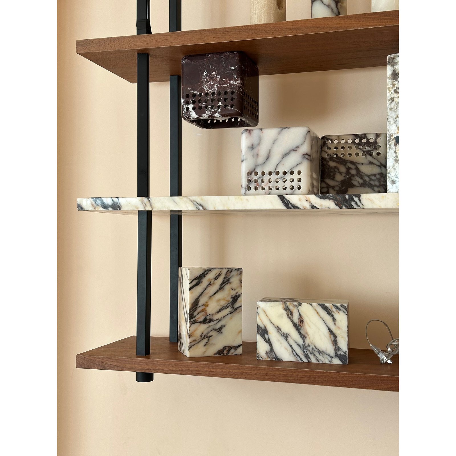 The Bond’s simple square form underscores its raw materiality. Carved from a solid block of stone, a grid of perforations in the fixture’s shade allow light to escape down and outward.
