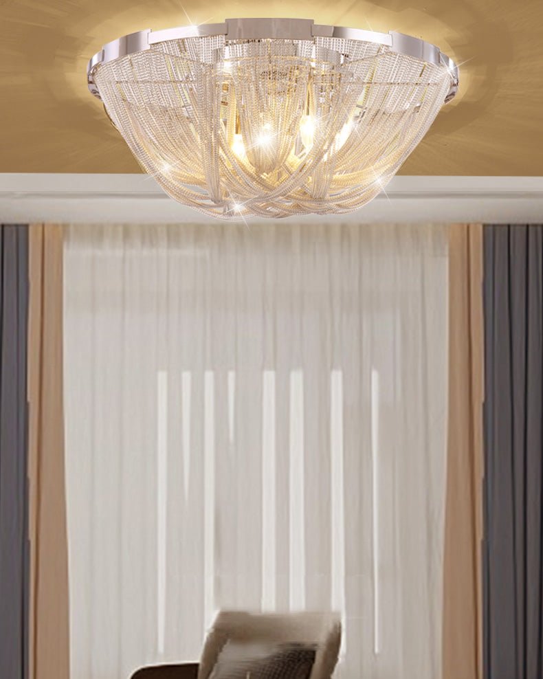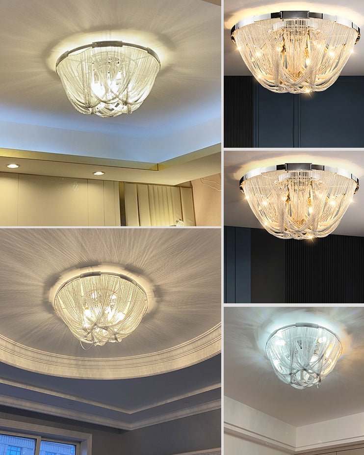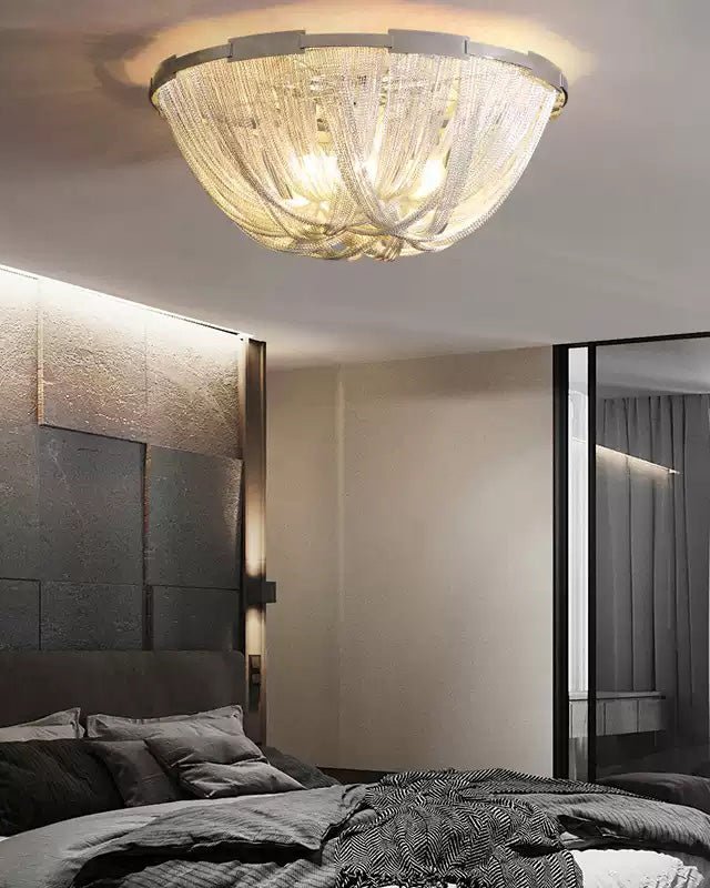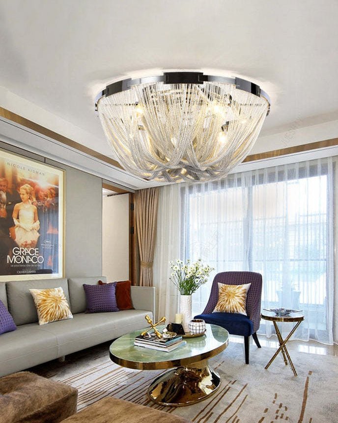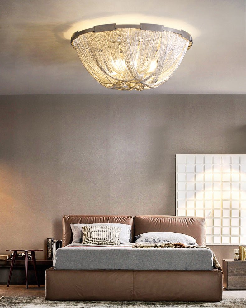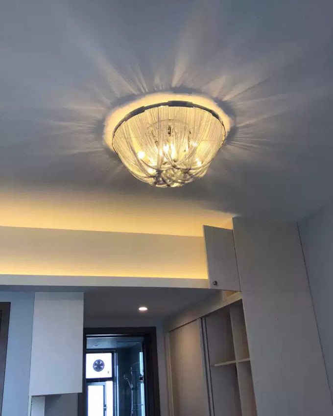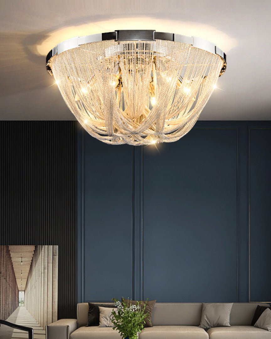 Bring a touch of luxury to your home with the Lume Luxury Chain Tassel Ceiling Light. The Art Deco design and metal construction of this light fixture exude elegance and sophistication. The chrome and gold finish adds a glamorous touch to any bedroom or living room. Elevate your space with this stunning ceiling light!