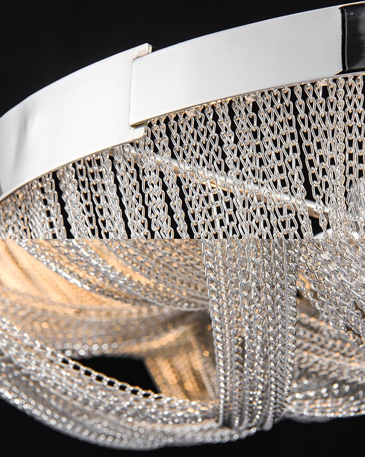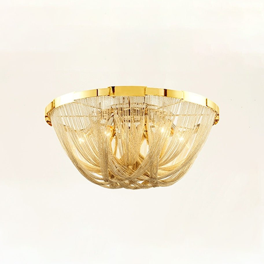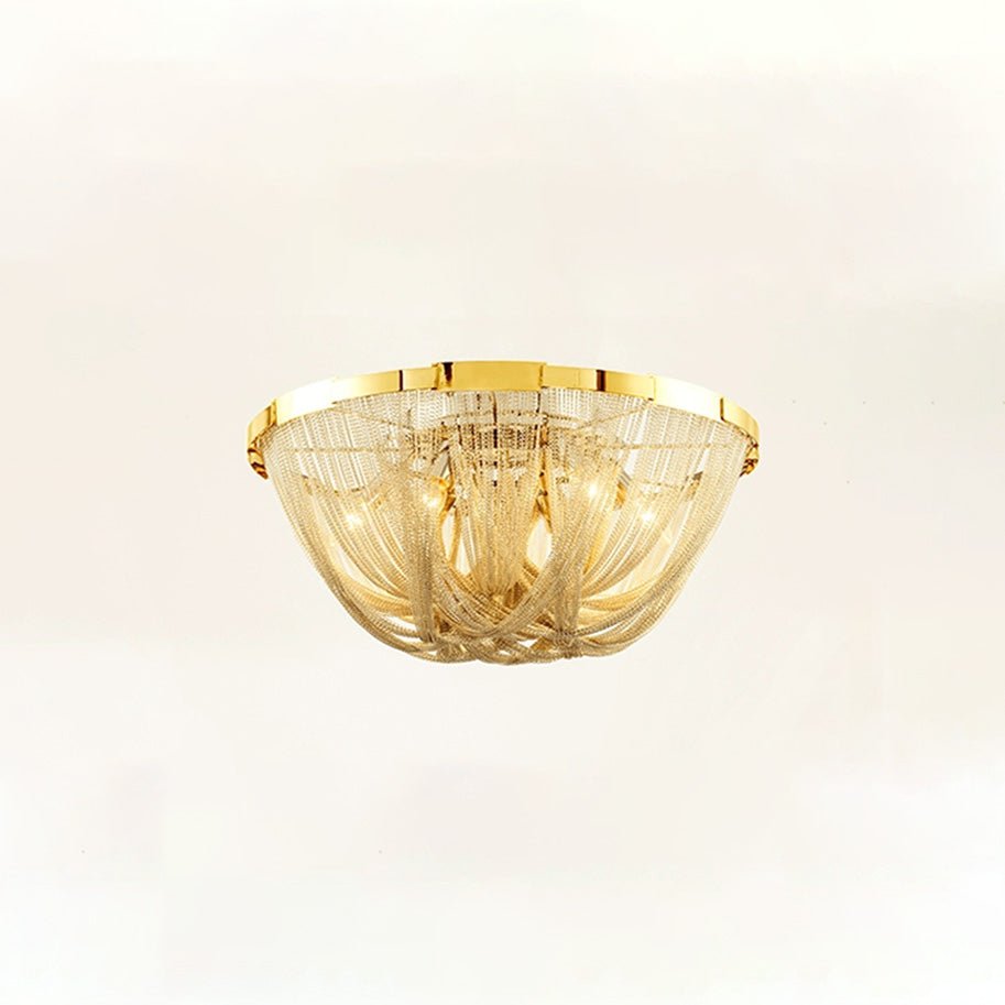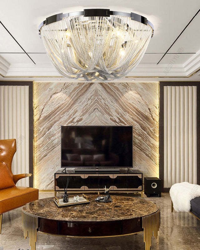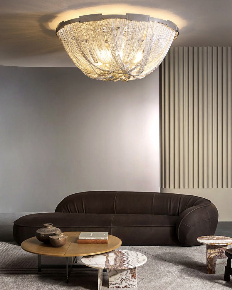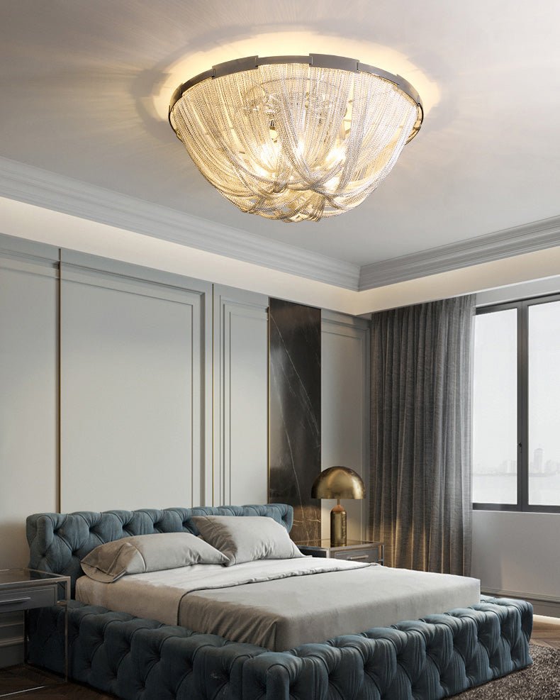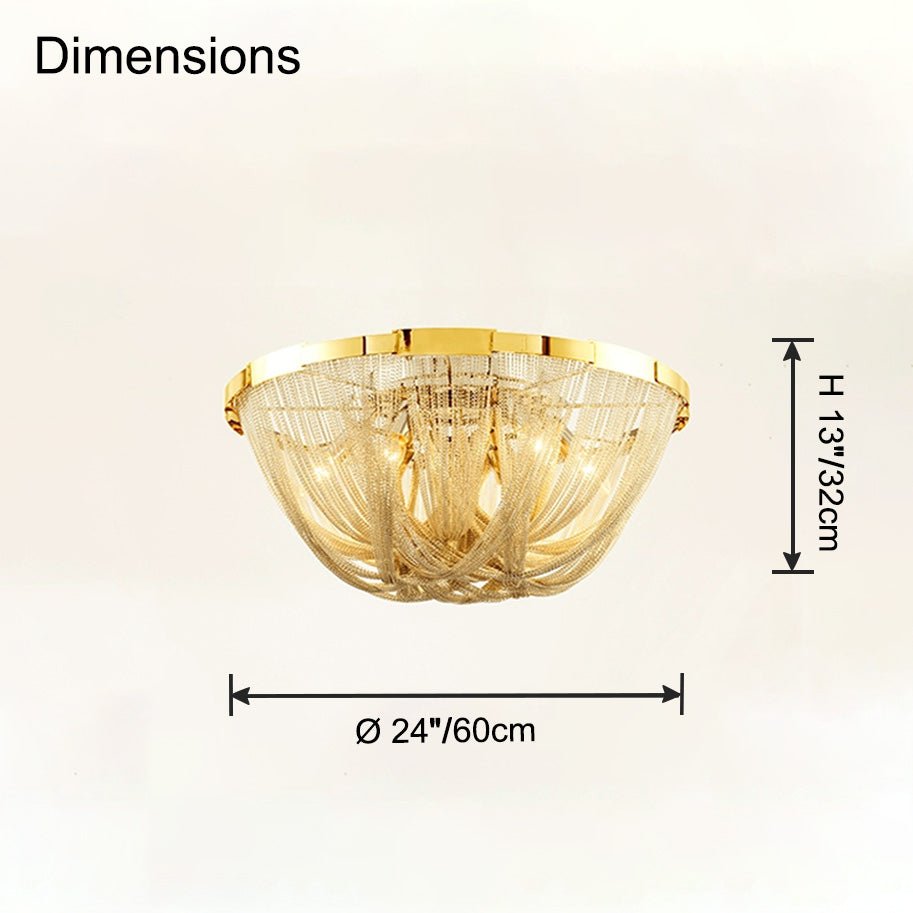 Bring a touch of luxury to your home with the Lume Luxury Chain Tassel Ceiling Light. The Art Deco design and metal construction of this light fixture exude elegance and sophistication. The chrome and gold finish adds a glamorous touch to any bedroom or living room. Elevate your space with this stunning ceiling light!