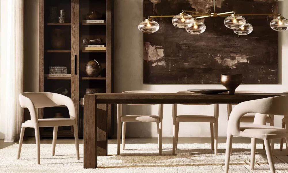 Handblown oval glass shades seem to float overhead in the Cabrette collection. Held by an industrial metal frame, the globes are suspended from black cords, marrying clean geometry with understated elegance.