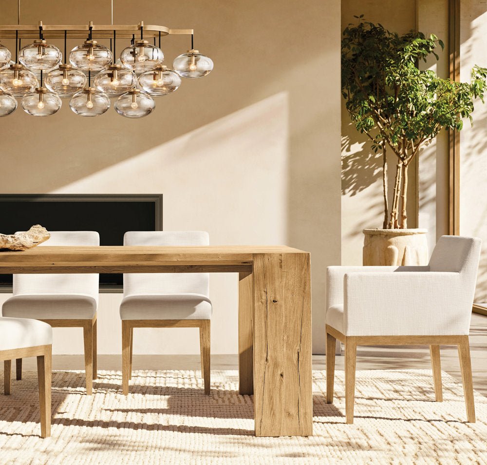 Handblown oval glass shades seem to float overhead in the Cabrette collection by San Francisco, California-based designer Jonathan Browning. Held by an industrial metal frame, the globes are suspended from black cords, marrying clean geometry with understated elegance.