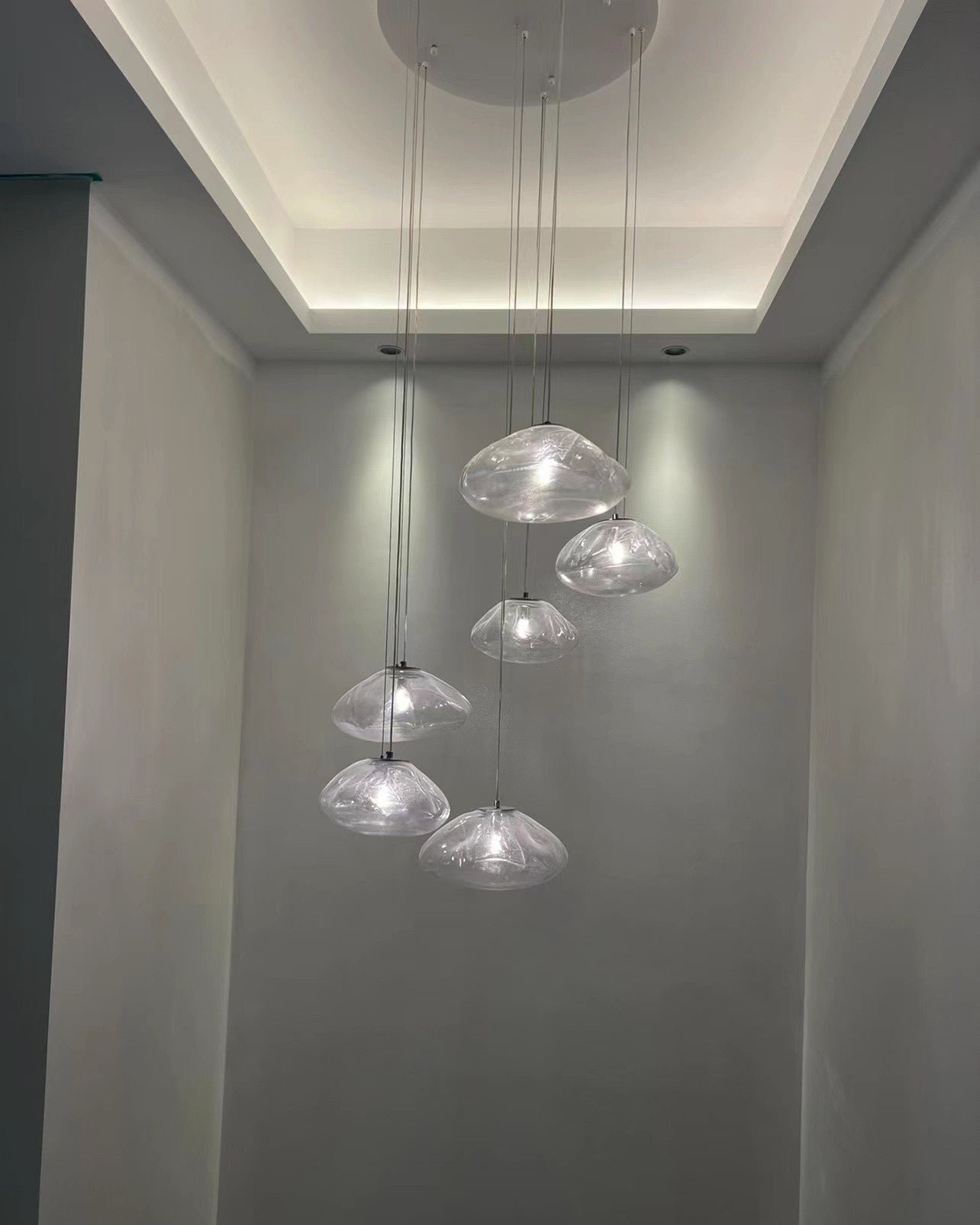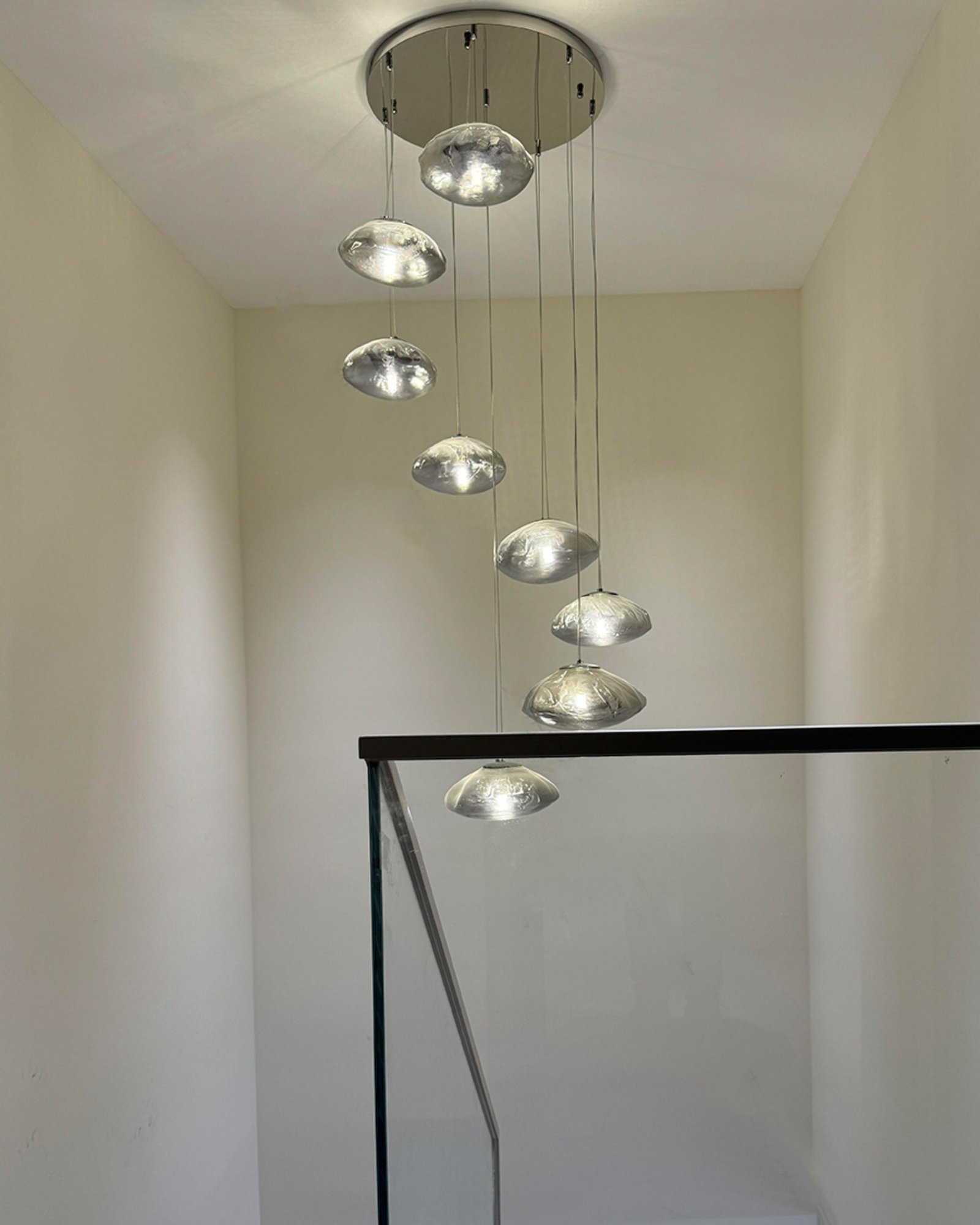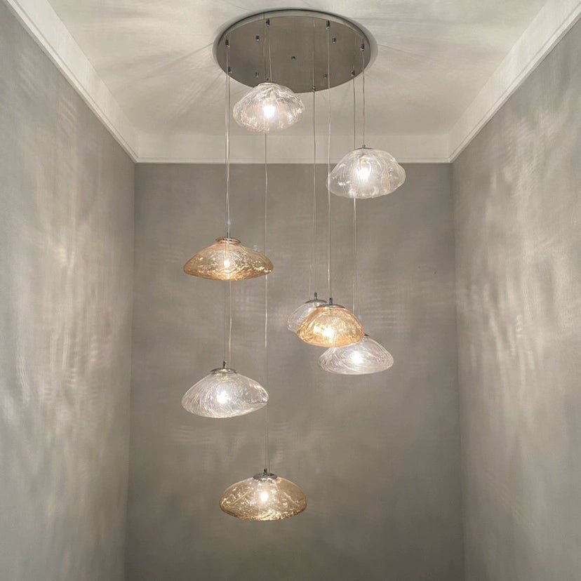This modern glass pendant chandelier features multiple hand-blown glass shades suspended at varying heights, creating a dynamic and elegant cascading effect. Each organic-shaped glass shade offers a soft, glowing light, ideal for stairwells, entryways, dining rooms, and high-ceiling spaces. Available in clear, amber, or smoky finishes, this artistic fixture combines contemporary style with sophisticated craftsmanship, perfect for adding a luxurious statement to any modern interior.