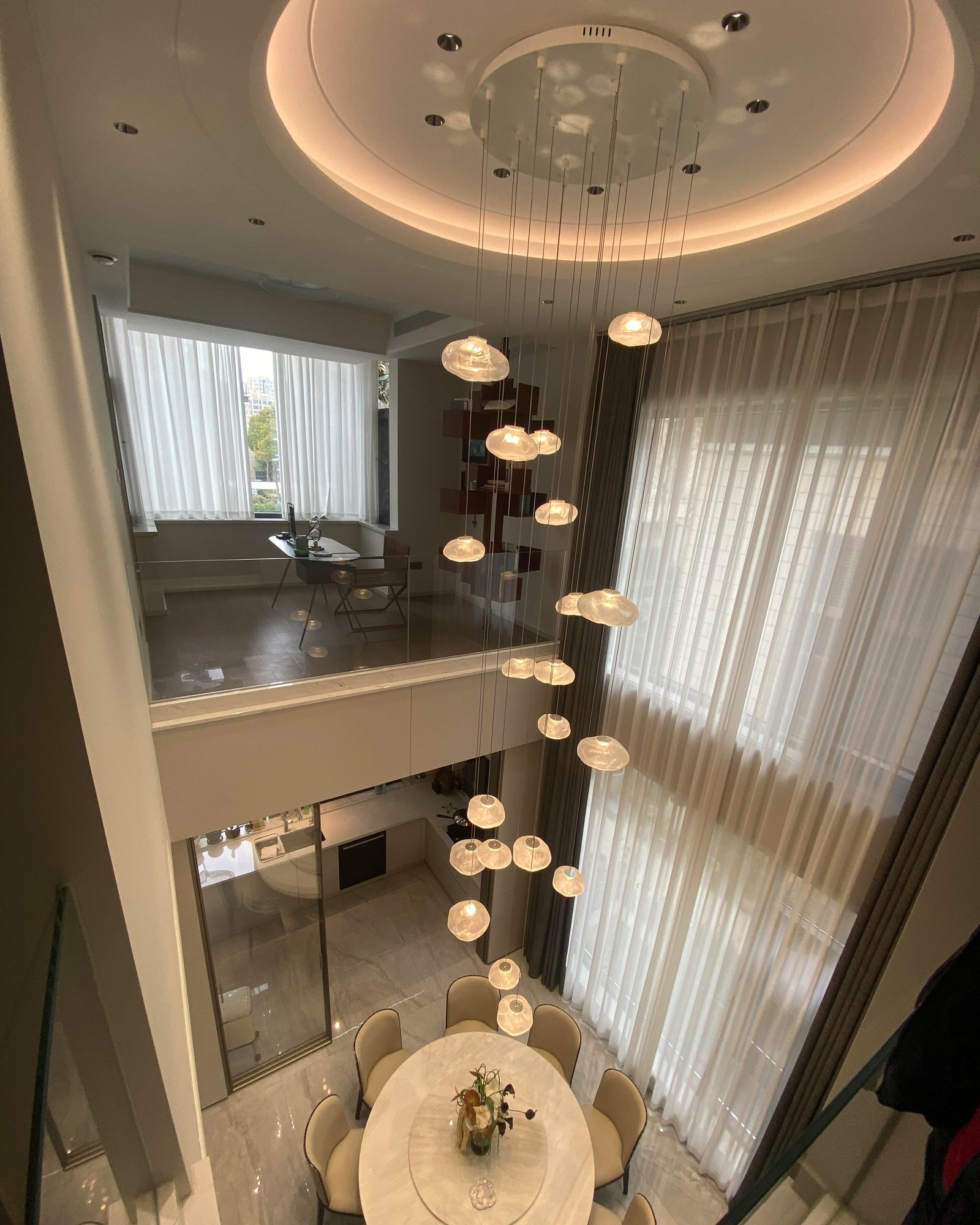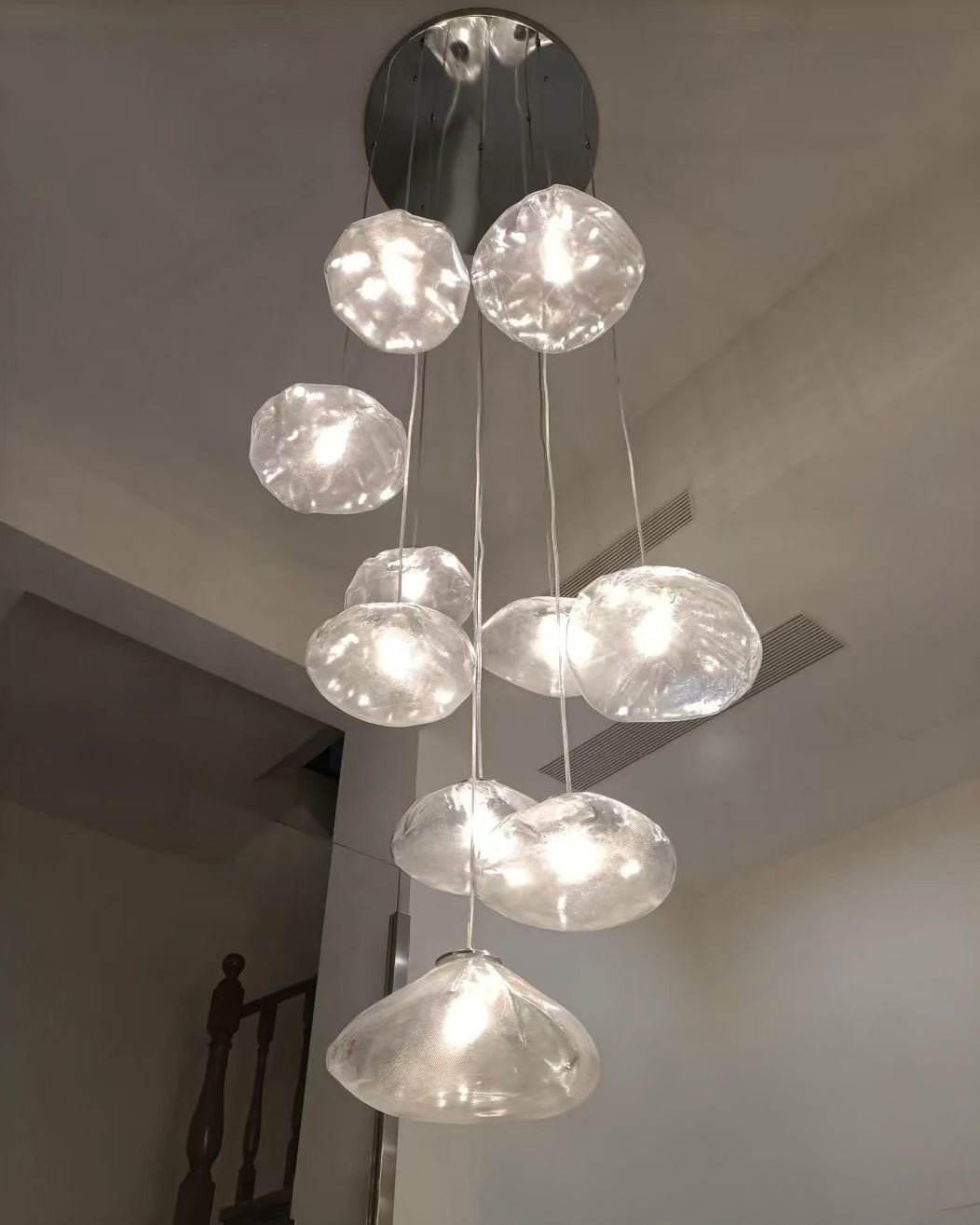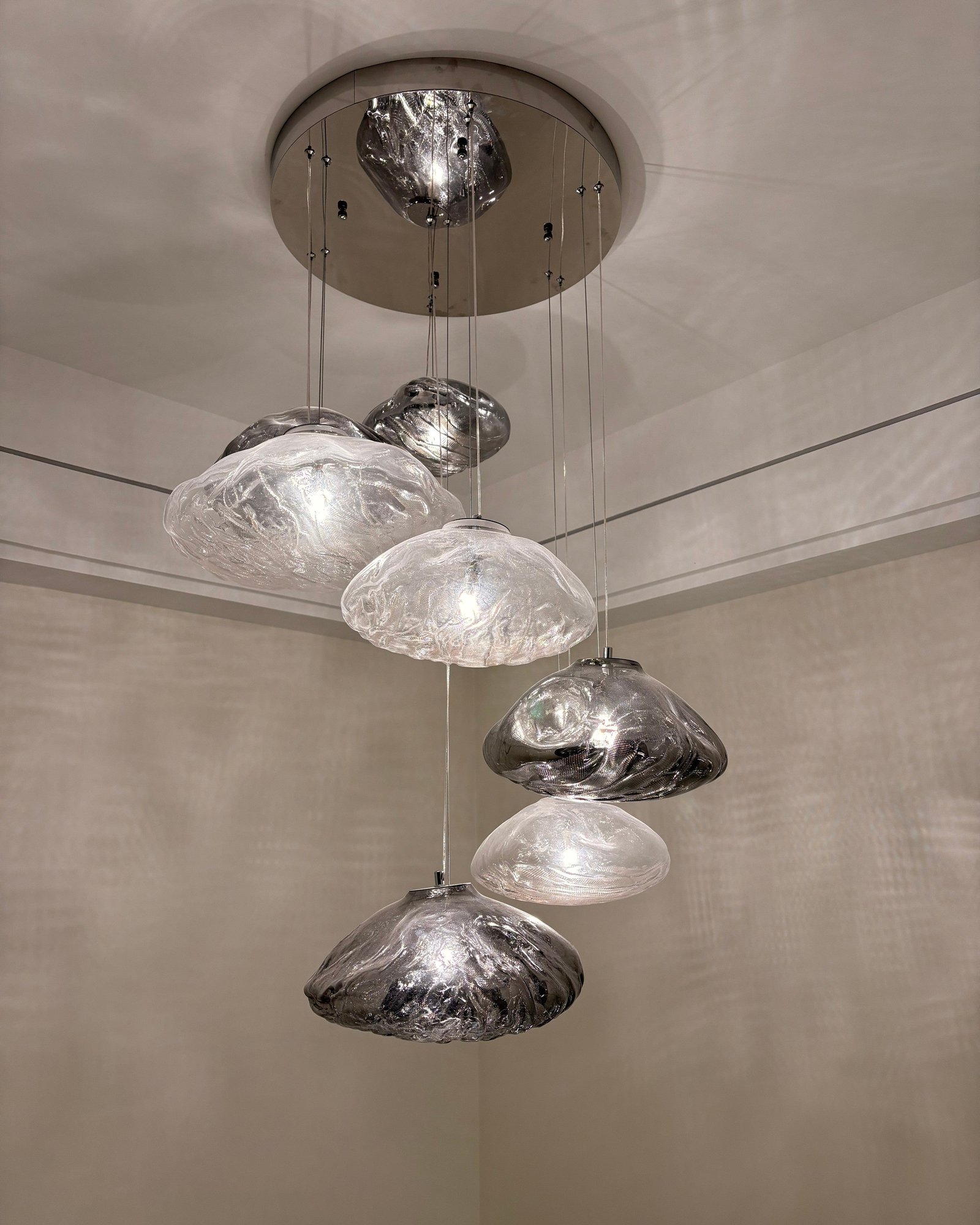 This modern glass pendant chandelier features multiple hand-blown glass shades suspended at varying heights, creating a dynamic and elegant cascading effect. Each organic-shaped glass shade offers a soft, glowing light, ideal for stairwells, entryways, dining rooms, and high-ceiling spaces. Available in clear, amber, or smoky finishes, this artistic fixture combines contemporary style with sophisticated craftsmanship, perfect for adding a luxurious statement to any modern interior.