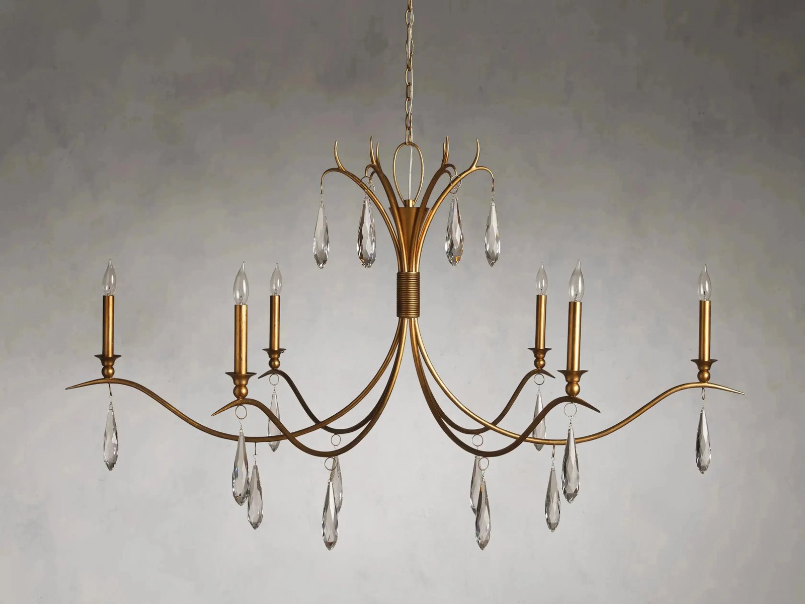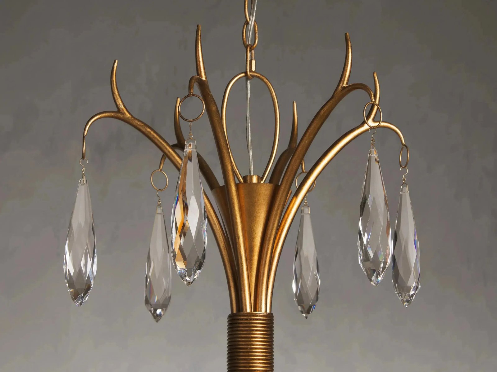 - Our stunning Celine Chandelier is adorned with 18 crystal drops that shimmer when illuminated. Its grand scale and warm, gold leaf finish make Celine a focal point in any home.