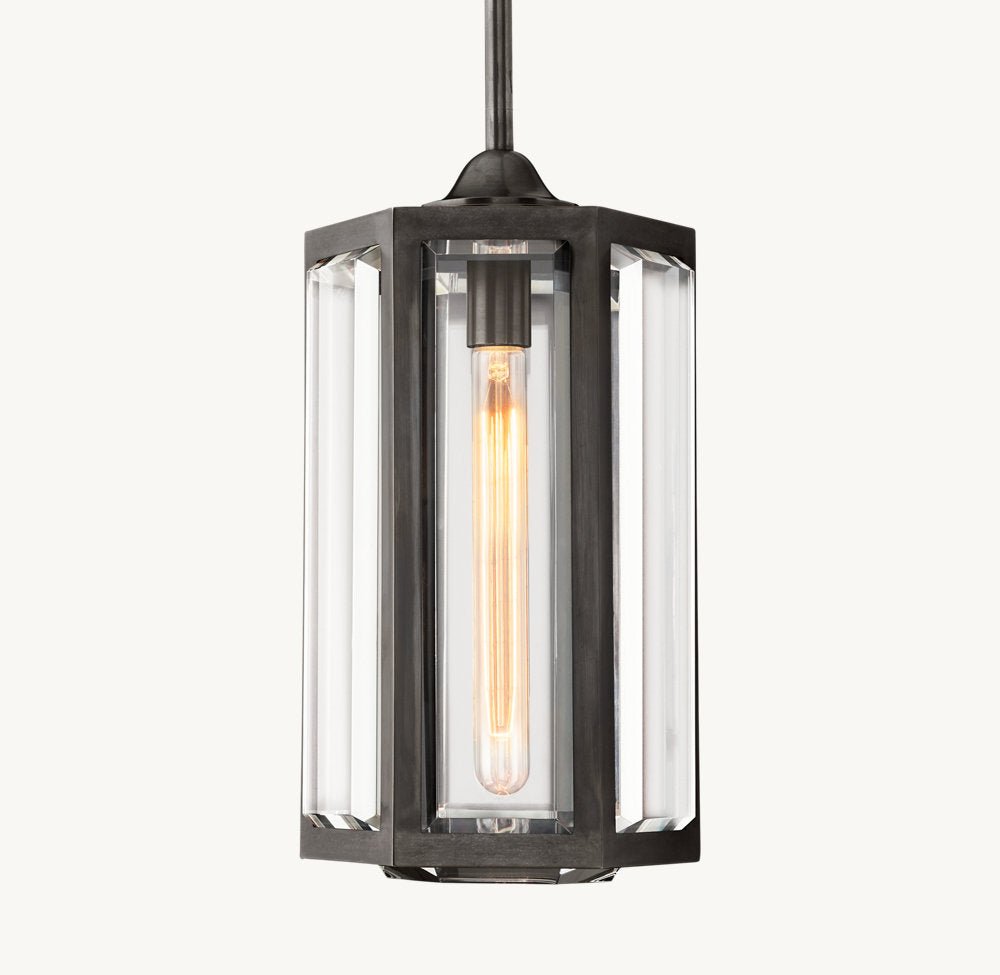 Deceptively simple, uncommonly familiar, designer Jonathan Browning’s pendant is defined by its refined details. Crafted of thick-gauge, solid metal, its crystal panels bevel outward to refract the light.