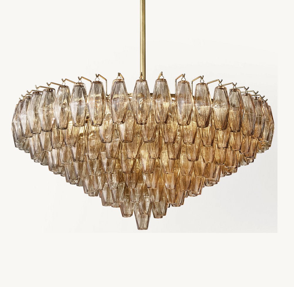Paying homage to Murano glass chandeliers of 1950s Italy, our fixture celebrates the period’s minimalist spirit in a grand manner. Radiating from a tiered steel frame, dozens of handblown glass polyhedrons hang from individual hooks. Lit from within, the faceted pendants dramatically reflect and refract the light.