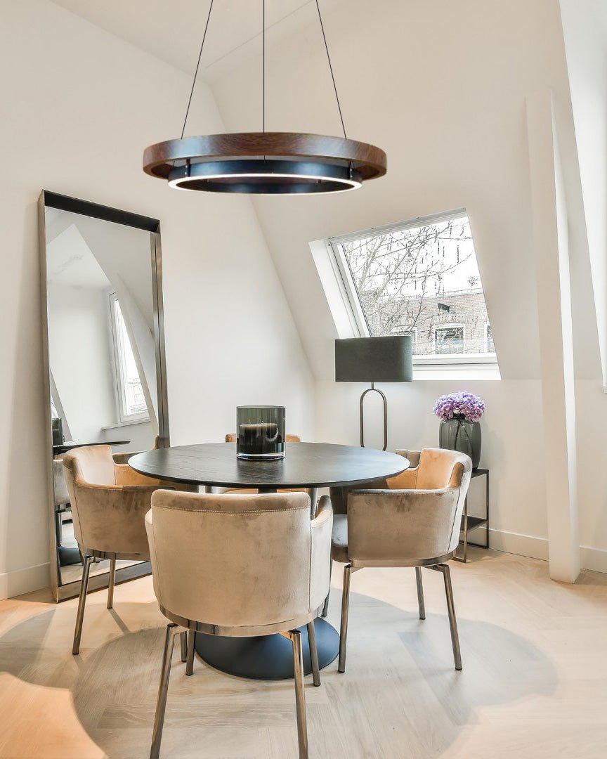 Add a touch of modern farmhouse charm to your dining room with the jucci Wood Circular Led Chandelier-WM2492. The upper ring in weathered oak or walnut pairs beautifully with the lower black ring, which integrates a LED strip for added functionality and style. Elevate your dining experience with this stylish and energy-efficient chandelier.