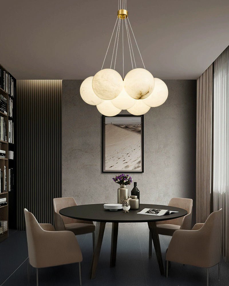 Enhance your dining or living room with the elegant jucci Modern Globe Alabaster Chandelier. Crafted with stunning alabaster accents and a gold or black finish, this chandelier adds a touch of luxury to any space. Perfect for creating a warm and inviting ambiance, this chandelier is a must-have for any home.