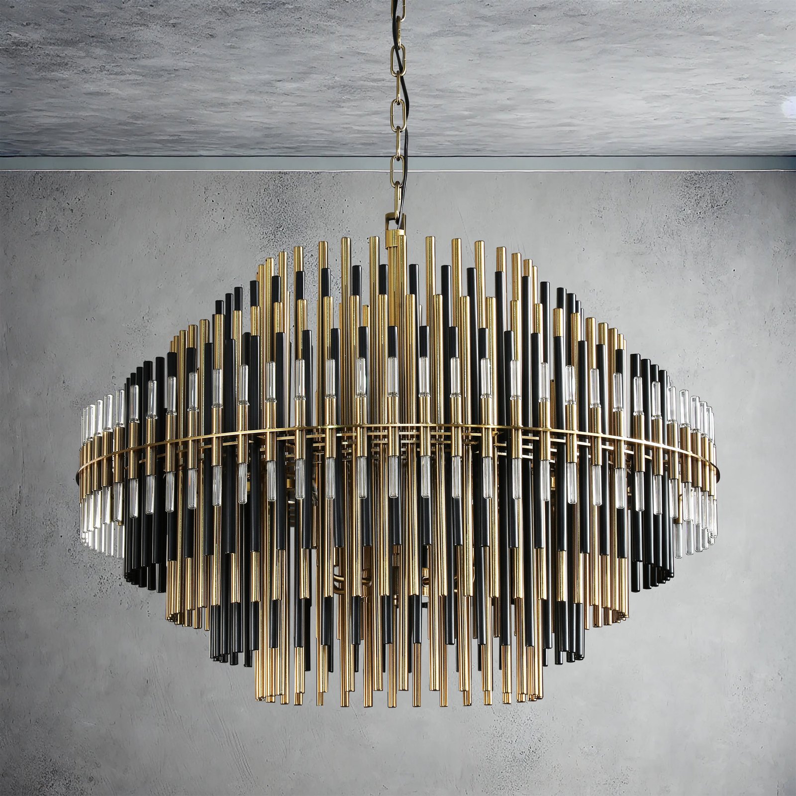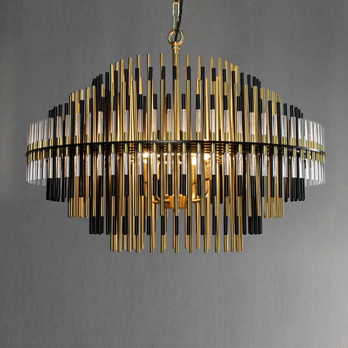 This chandelier is constructed from a metal frame and is inspired by the industrial design of the 1920s, a design used for decorative lighting. Multi-layered brass tubes make a unique feeling