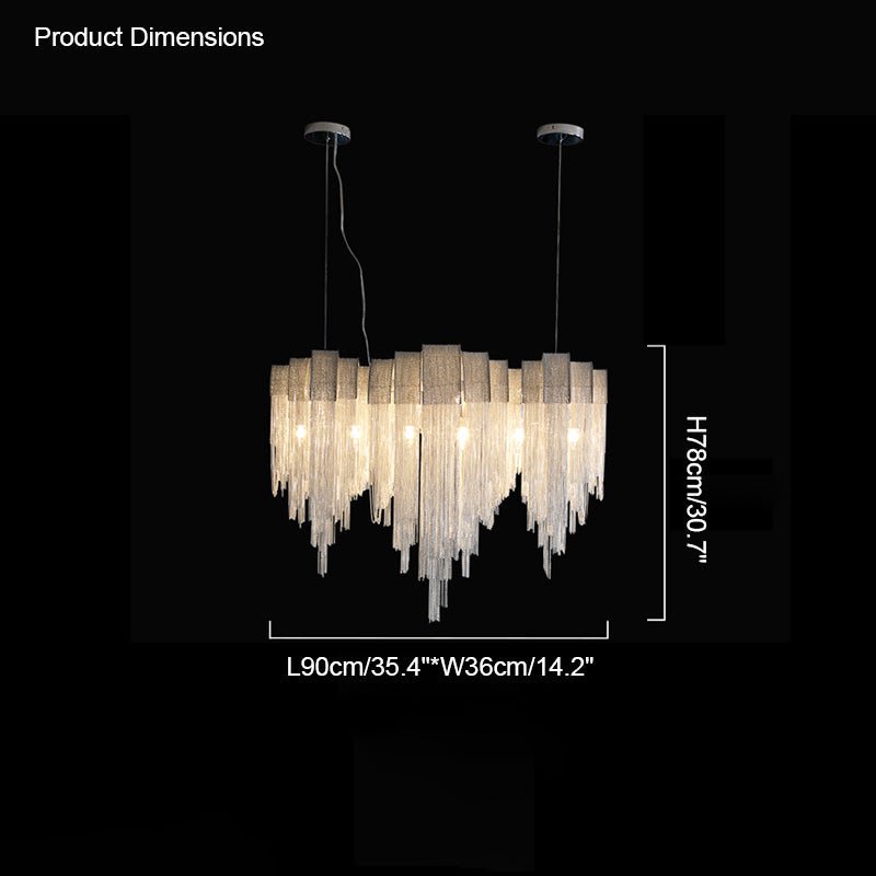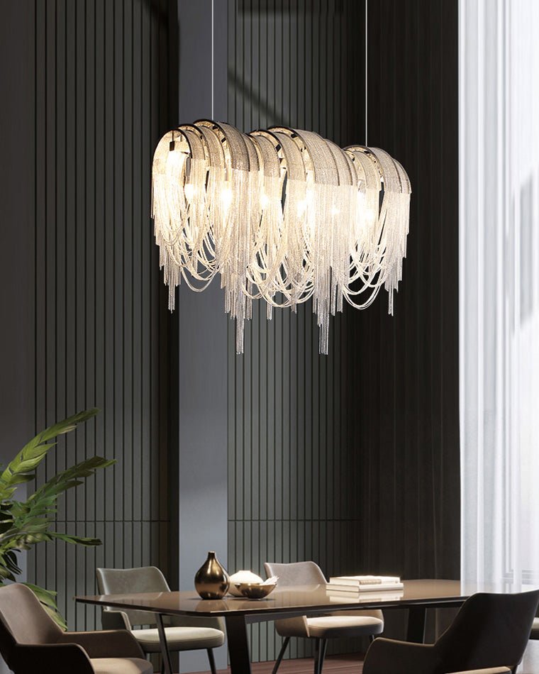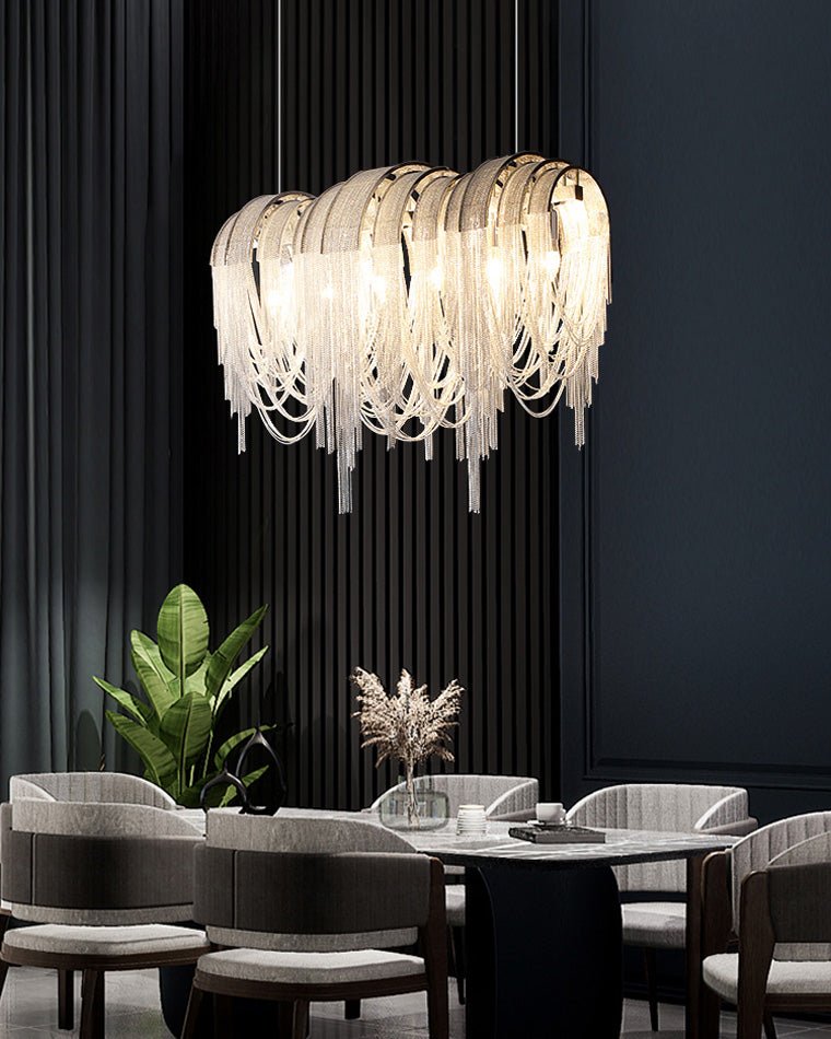 The volor Led chandelier is a luxurious blend of modern technology and art, silver chains are draped in clustered groups over a curved linear structure. This gives the chains a more dramatic, chunkier look than if they were draped singly. The delicate chain effectively diffuses the LED light housed within and creates a soft yet still eye-catching play of light above the dining table, kitchen island or living room.