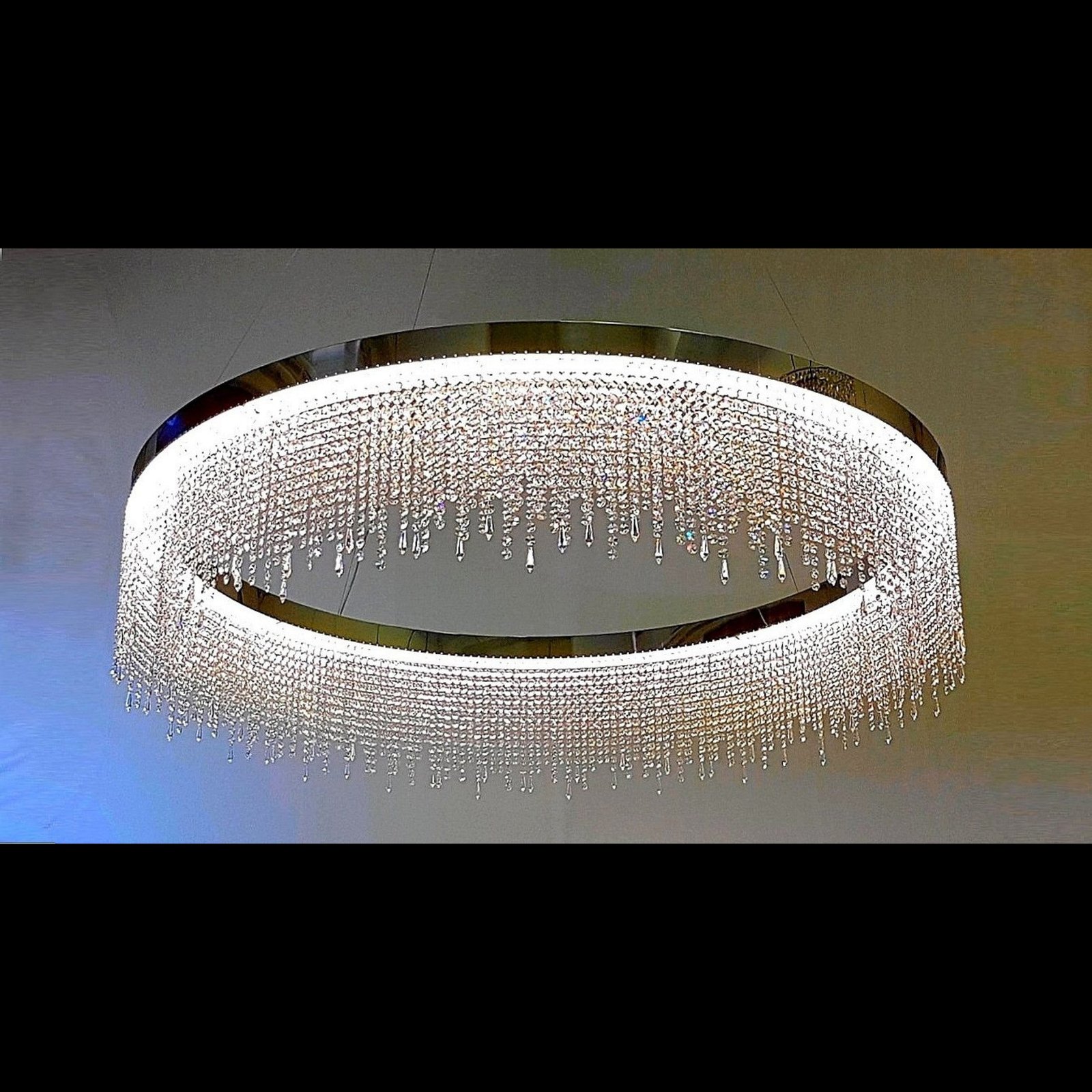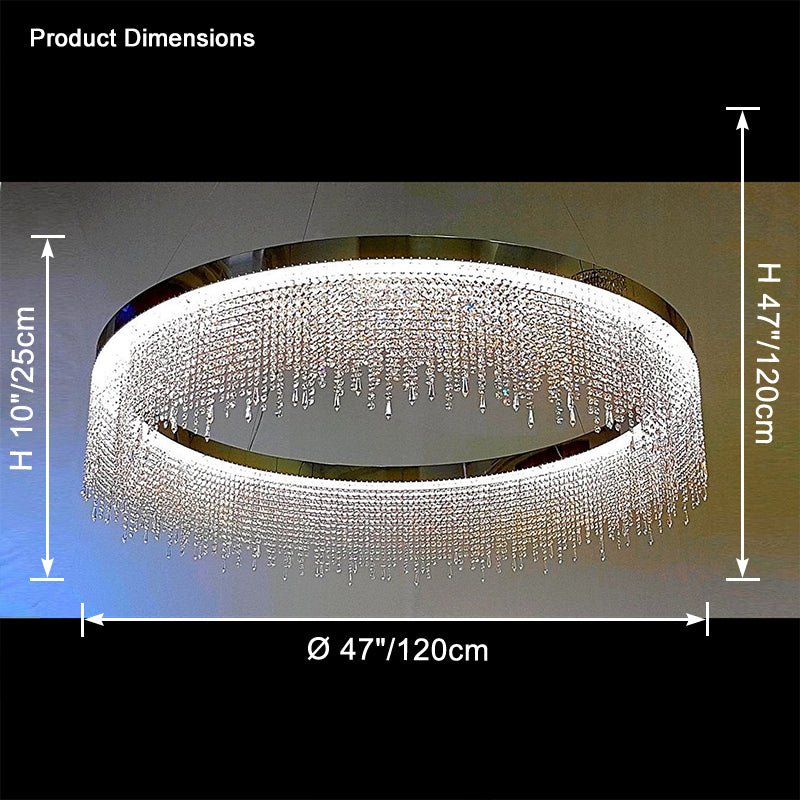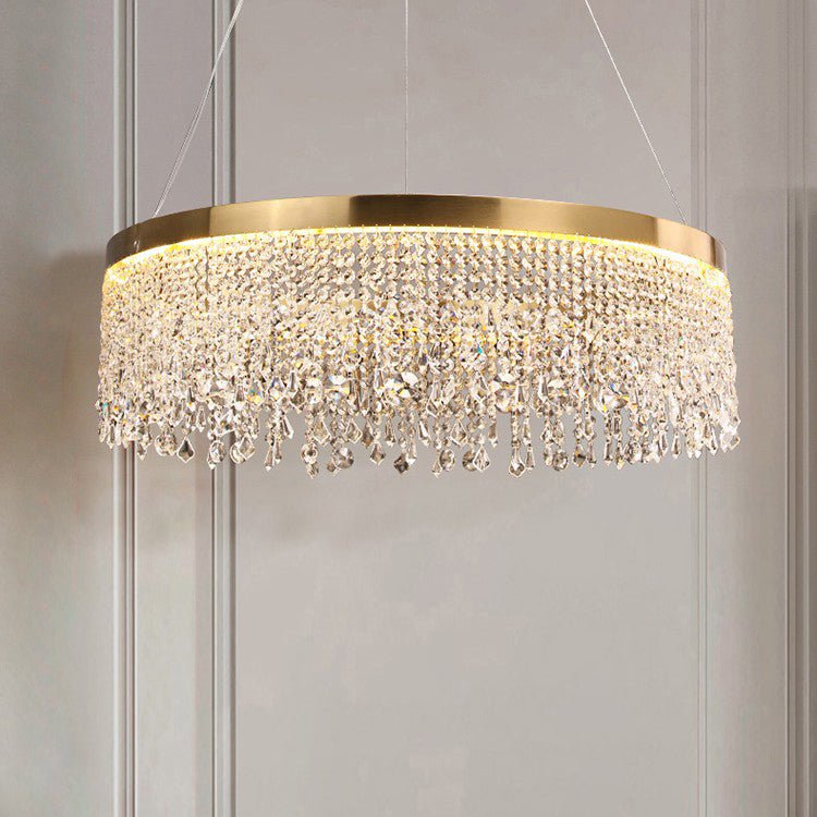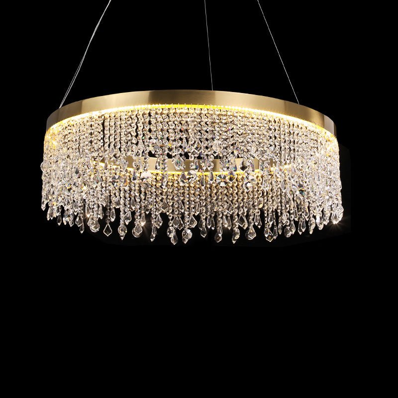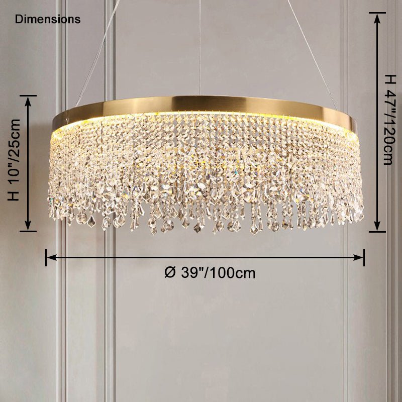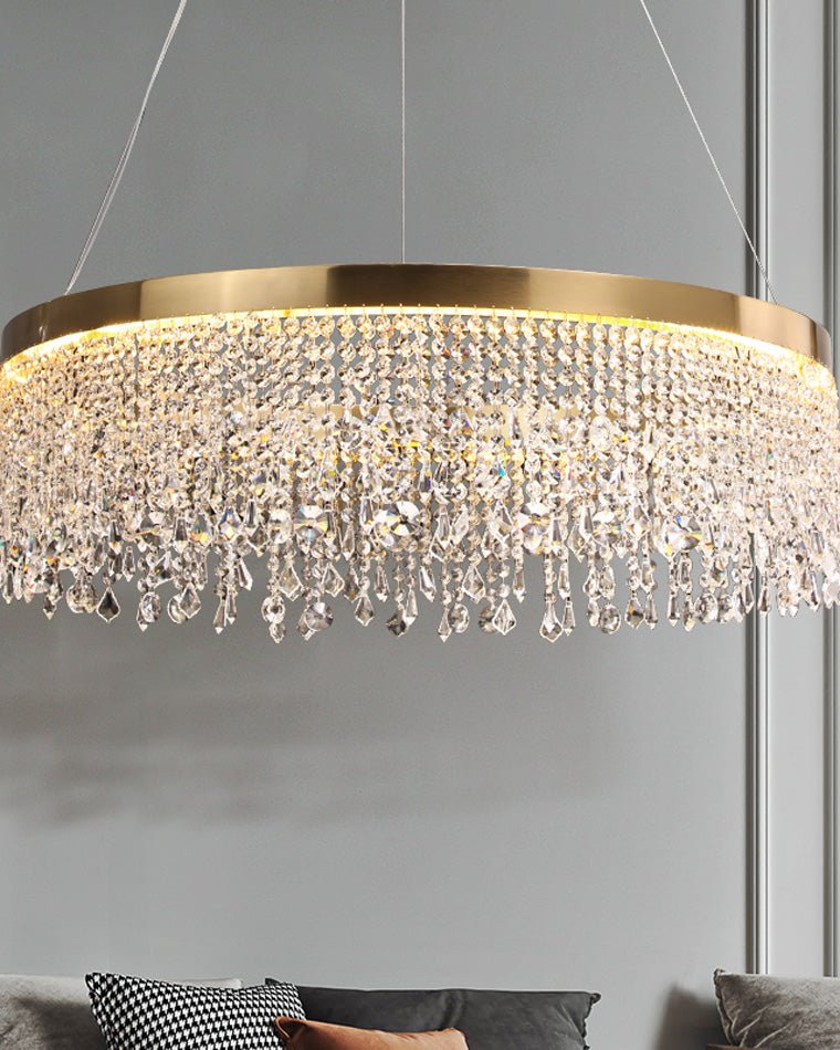 Transform any space into a luxurious oasis with the jucci Fringe Round Crystal Chandelier. Crafted with stunning gold and crystal accents, this contemporary chandelier adds a touch of elegance to your dining room, living room, or bedroom. Elevate your decor and create a captivating ambiance with this eye-catching piece!
