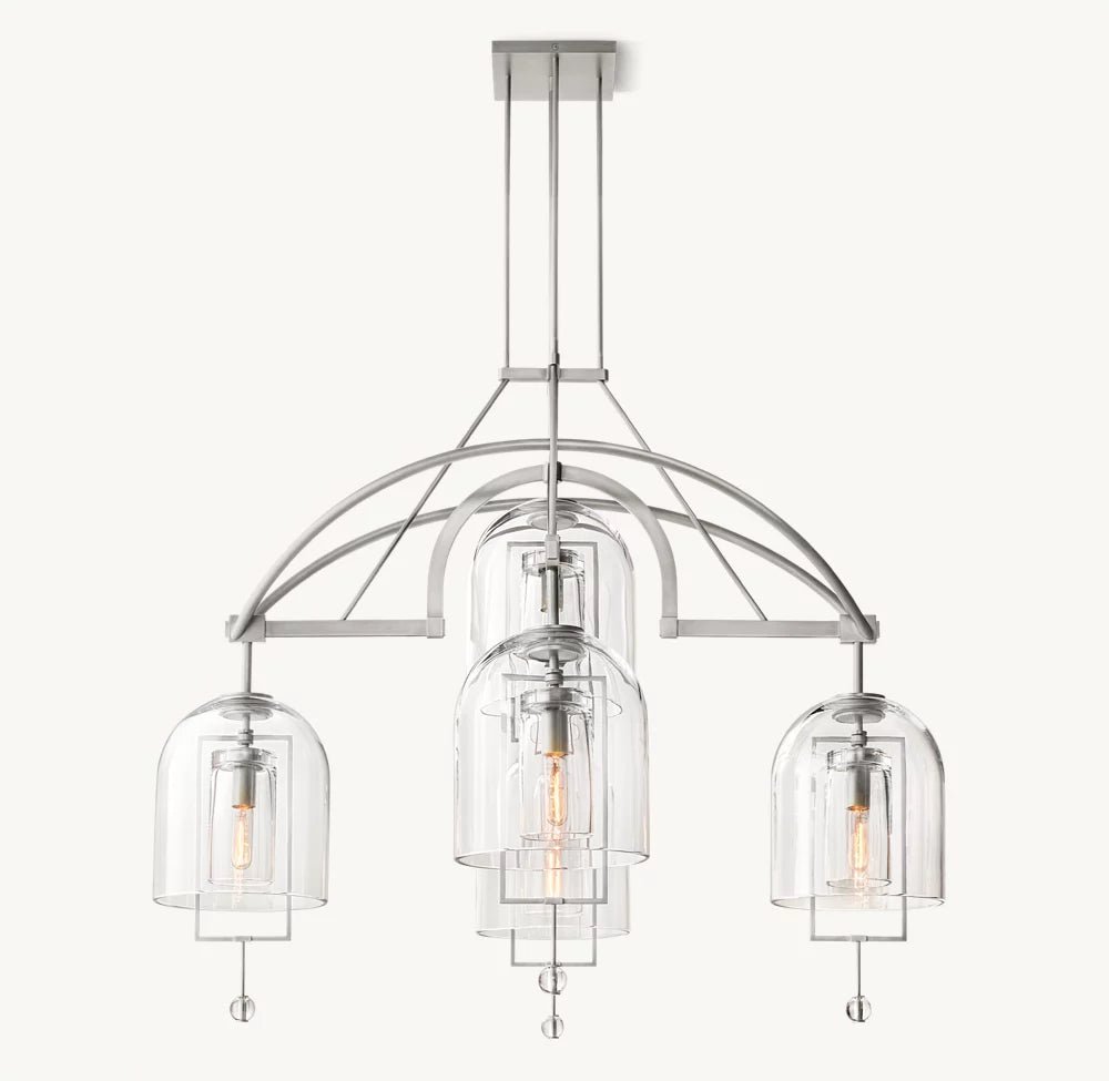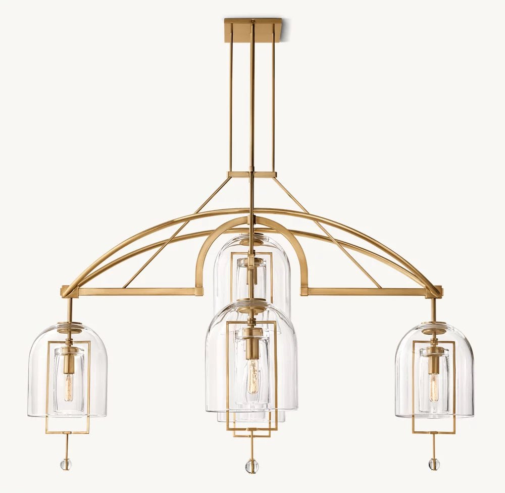 - The chandelier features five substantial ¼”-thick glass shades, each individually blown by a skilled artisan.