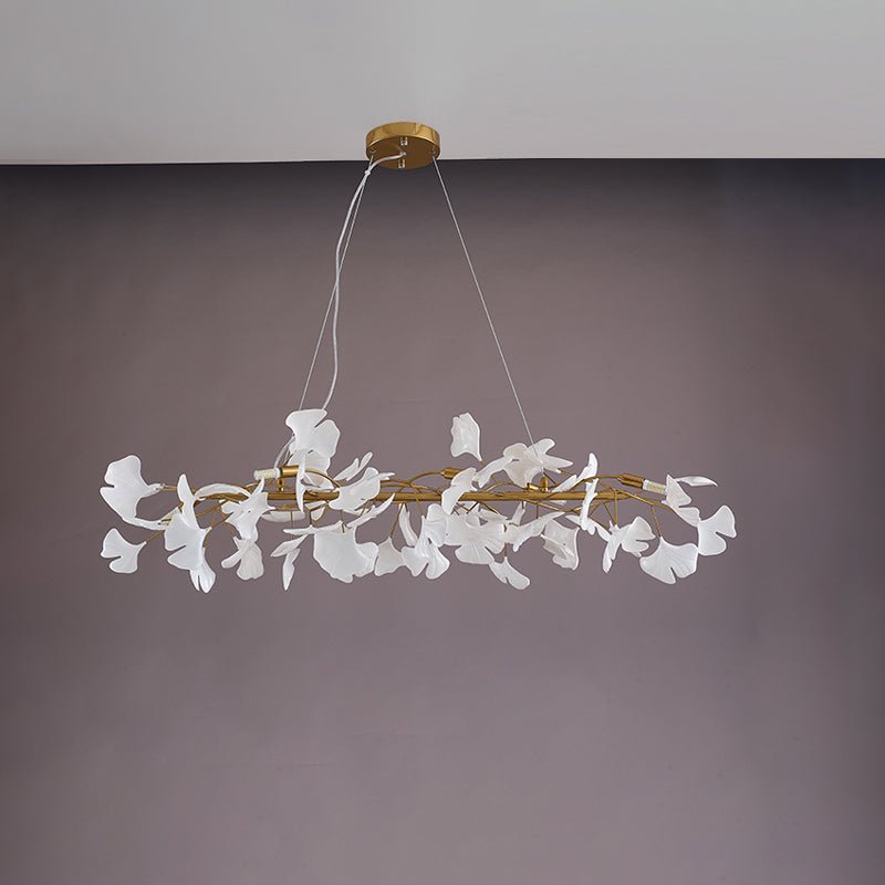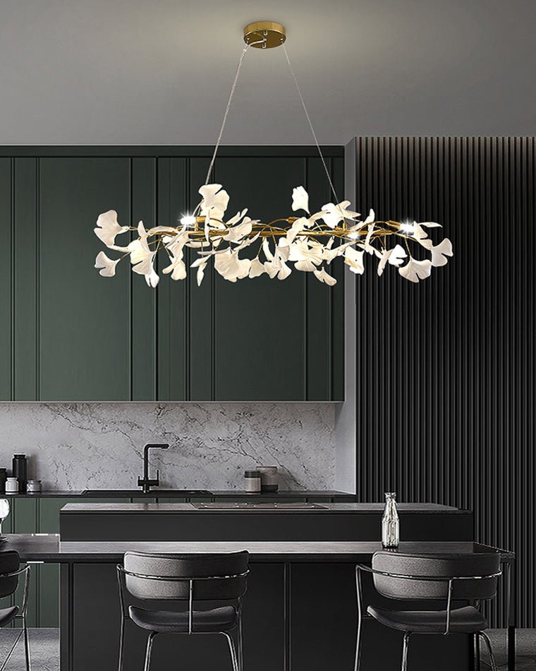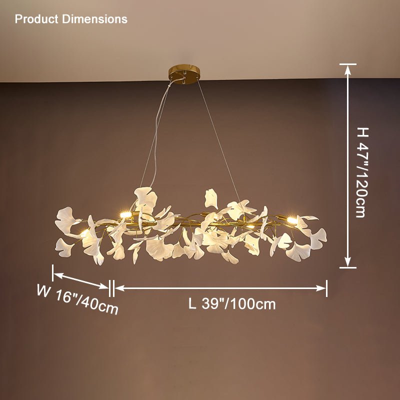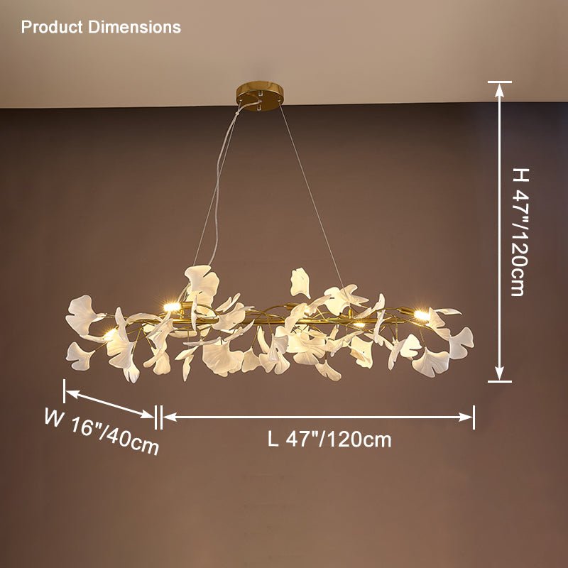 Upgrade your dining room with the elegant and modern design of the jucci Gingko Linear Chandelier-WM2413. Featuring white gingko ceramic leaves and a gold or black finish, this chandelier is a beautiful addition to any space. Bring a touch of nature into your home with this stunning and versatile piece!