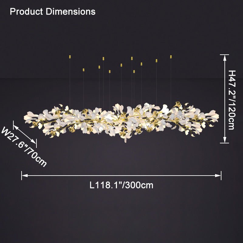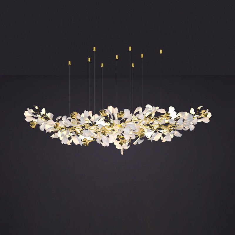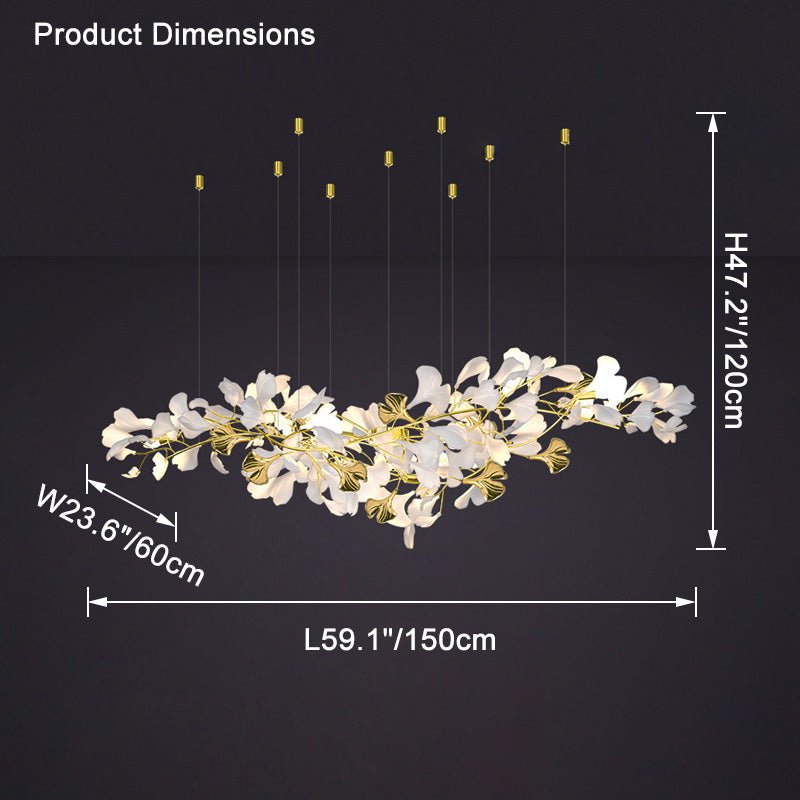 Elevate your dining room decor with our contemporary jucci Gingko Large Long Chandelier-WM2426. Made with delicate ceramic detailing, this stunning chandelier features a gorgeous gingko leaf design in white and gold. Impress your guests and add a touch of elegance to your space with this must-have statement piece.