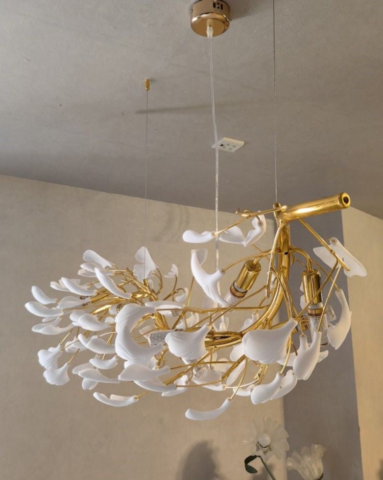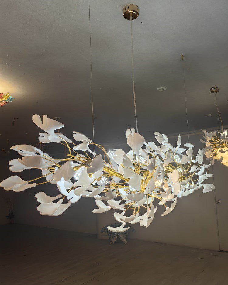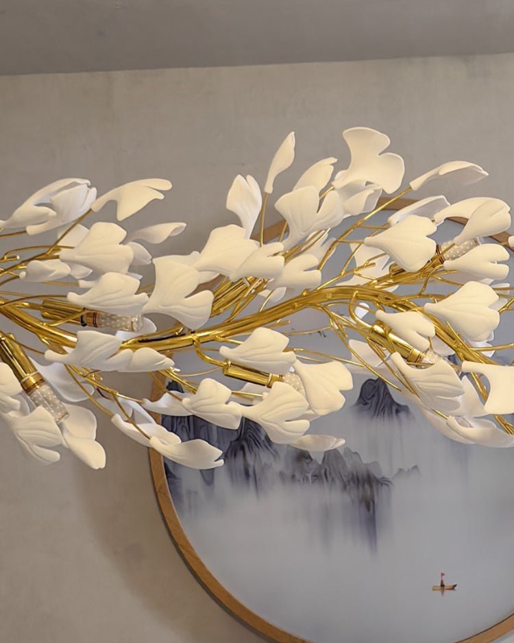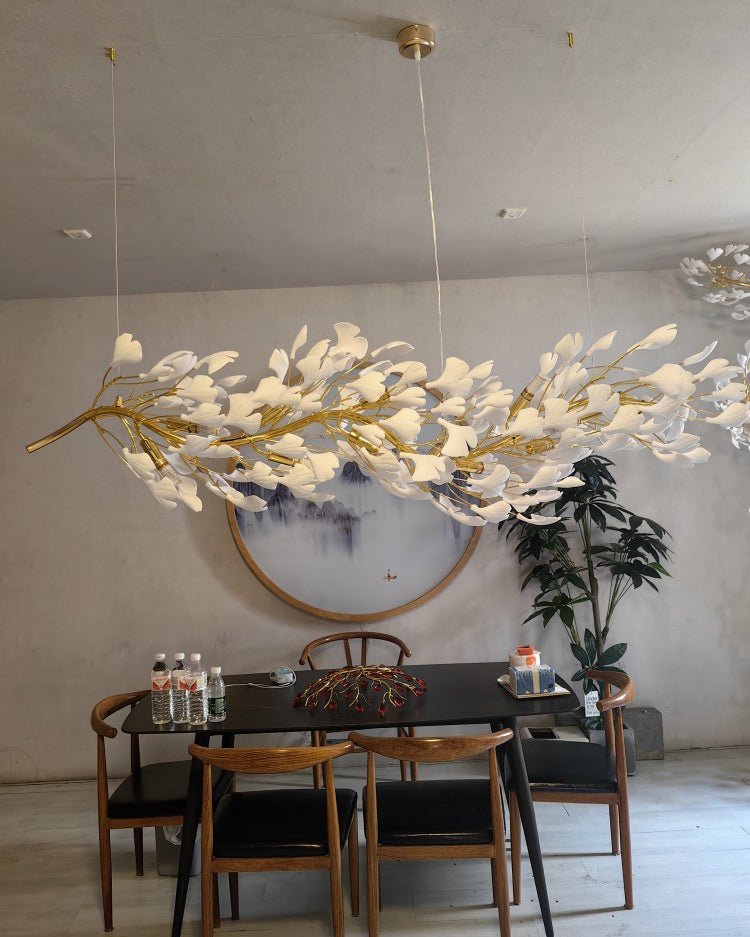 Introducing jucci Ginkgo Long Ceramic Chandelier-WM2490! Elevate your dining room with this luxurious and elegant piece, featuring a long branch of ginkgo leaves. Crafted from beautiful ceramic, it adds a touch of grandeur to any space. Transform your home into a stunning sanctuary with this exquisite chandelier.