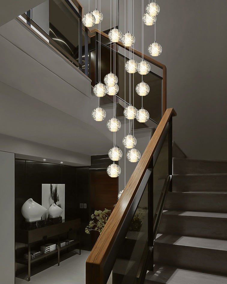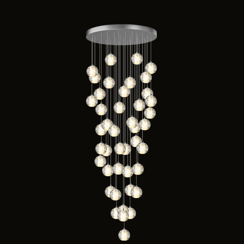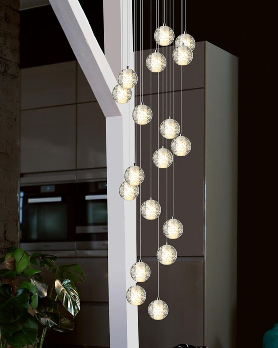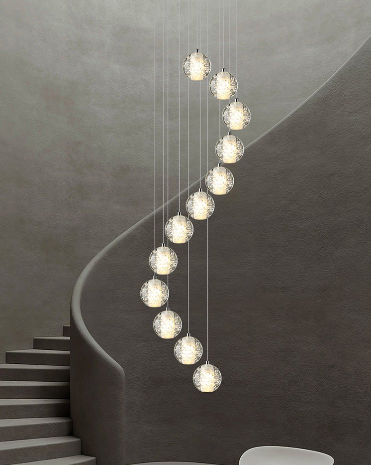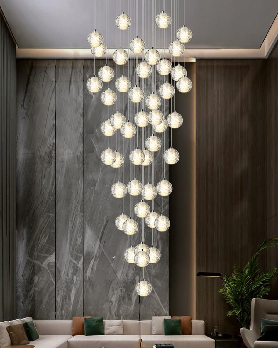Elevate your space with the stunning jucci Cascading Glass Ball Chandelier. Featuring cascading seeded glass balls and a gleaming chrome canopy, this chandelier is perfect for adding a touch of sophistication to any staircase or dining room. Bring the beauty of a rainstorm indoors and create a mesmerizing ambiance that will surely impress your guests.