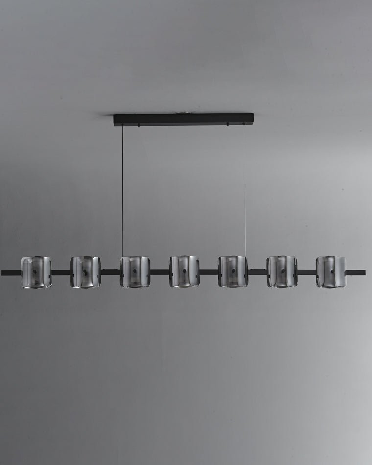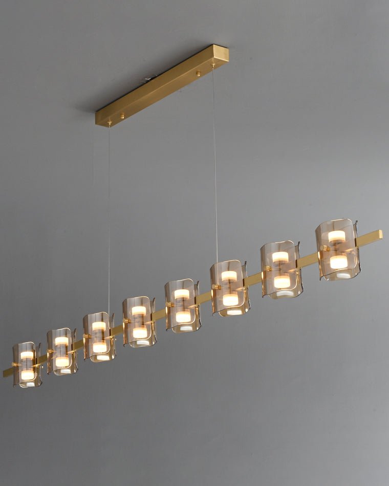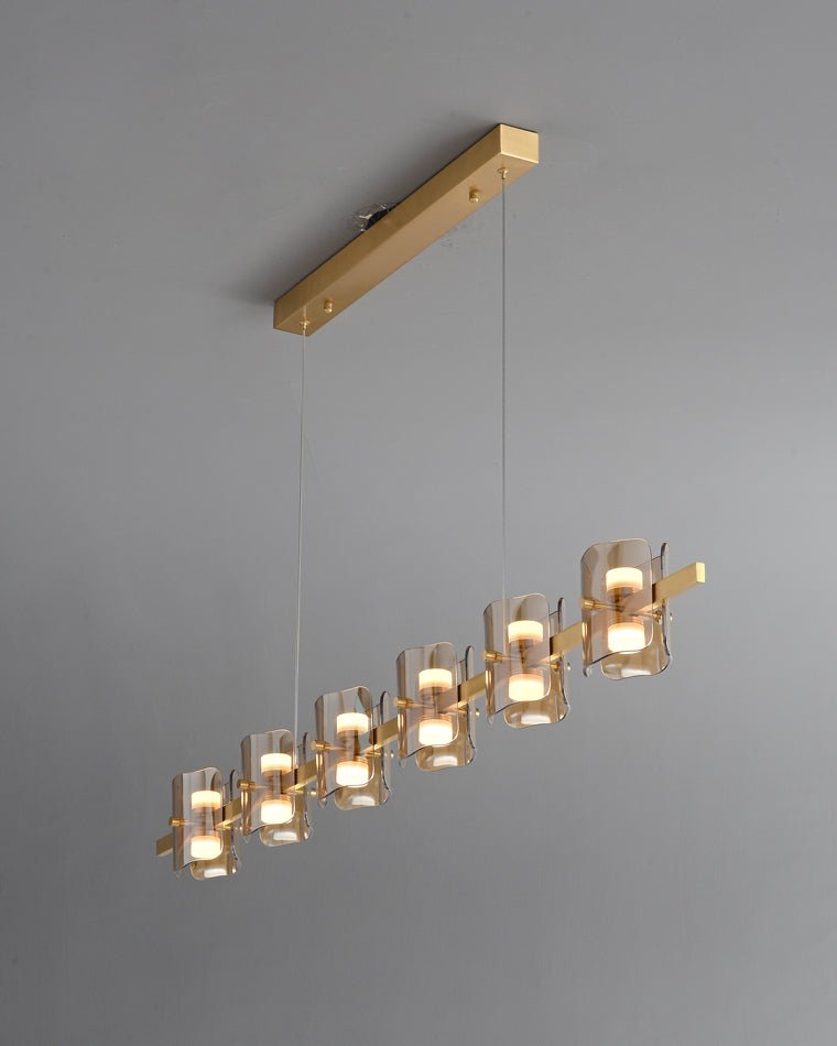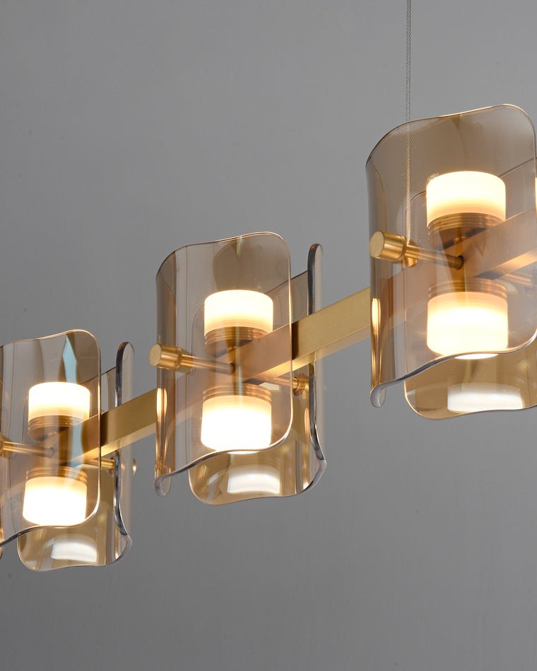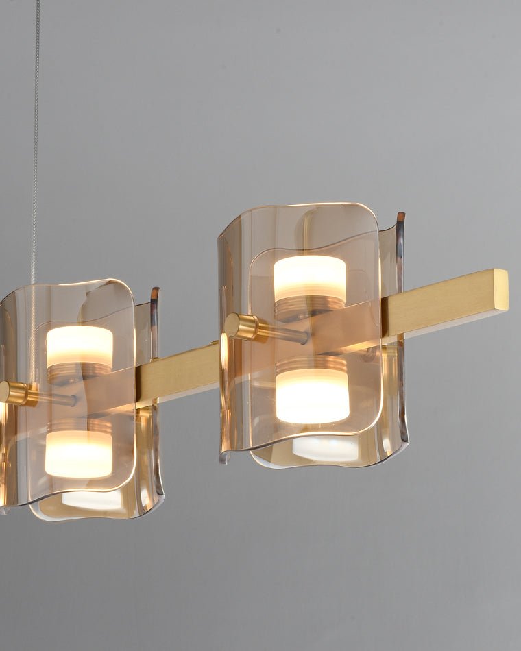 The Linear brass/copper frame is evenly distributed with multiple LED light sources, each wrapped in two tiles of smoked glass or amber glass lampshade, which makes the light visually comfort. With this gold and black modern design, the lamp brings a sophisticated and elegant atmosphere to your living room, bedroom or dining room.