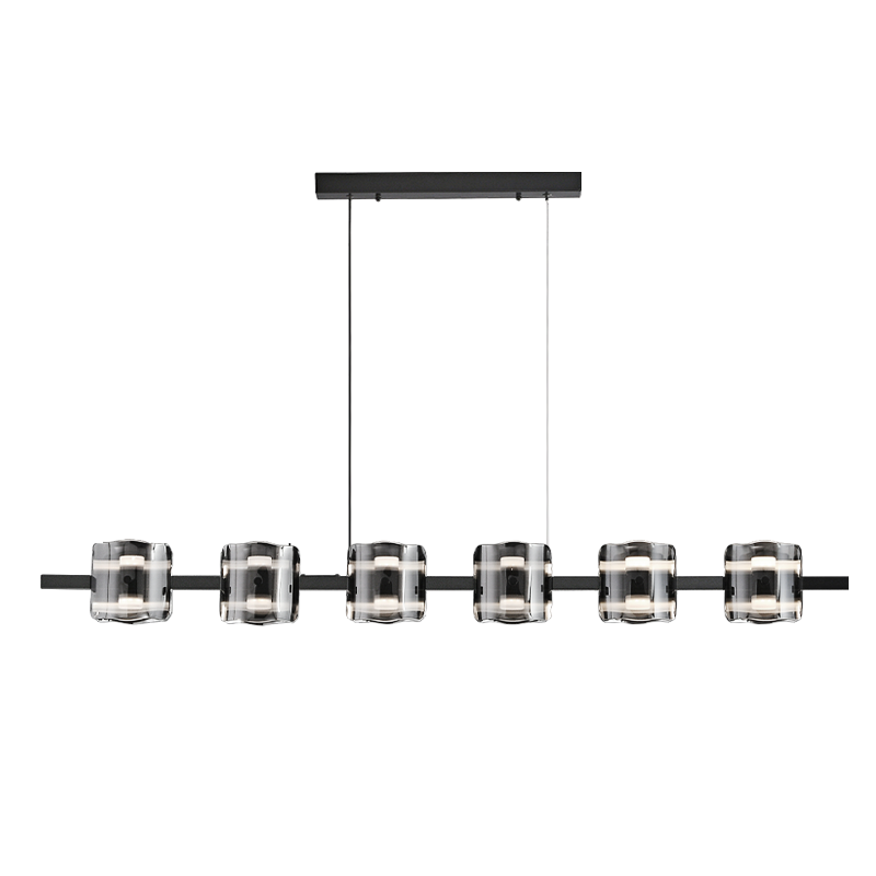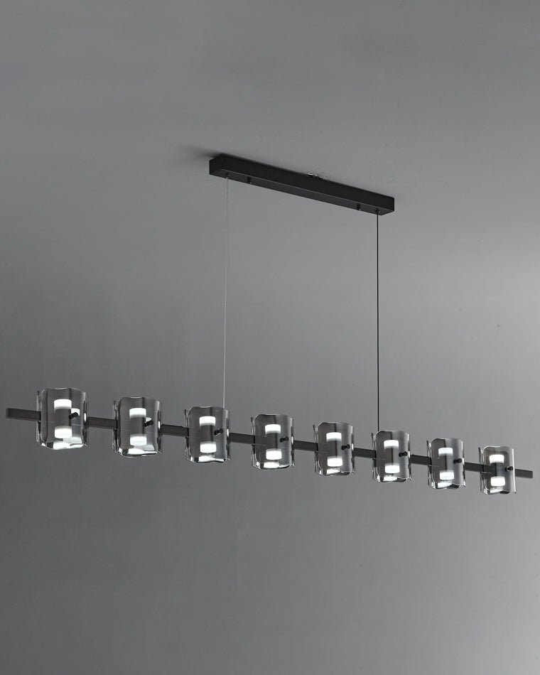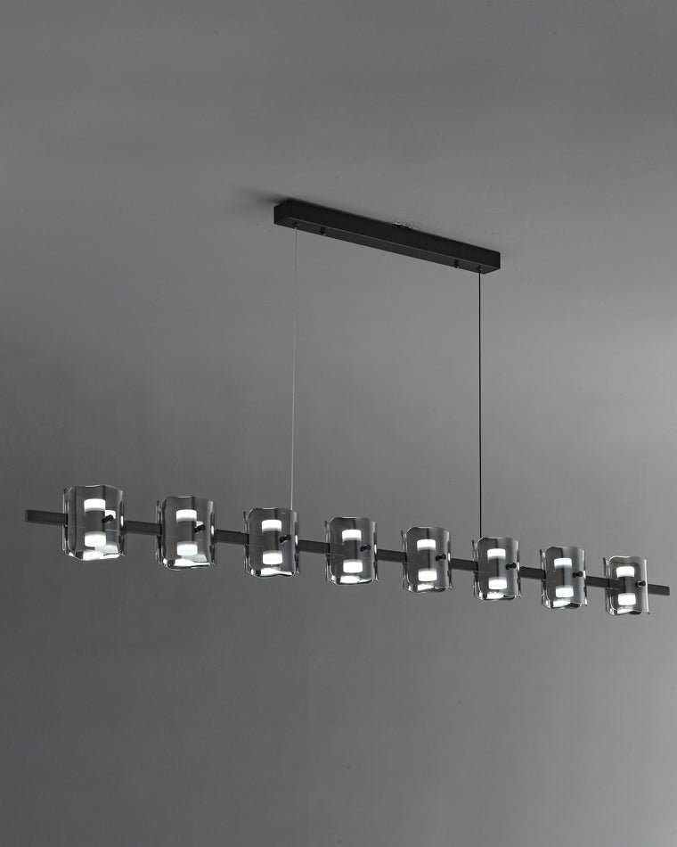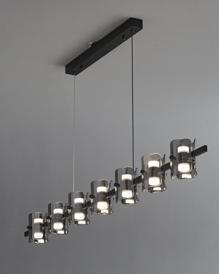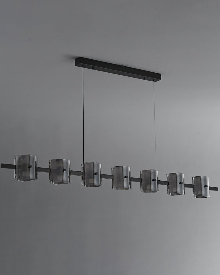 The Linear brass/copper frame is evenly distributed with multiple LED light sources, each wrapped in two tiles of smoked glass or amber glass lampshade, which makes the light visually comfort. With this gold and black modern design, the lamp brings a sophisticated and elegant atmosphere to your living room, bedroom or dining room.