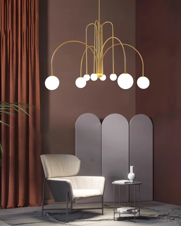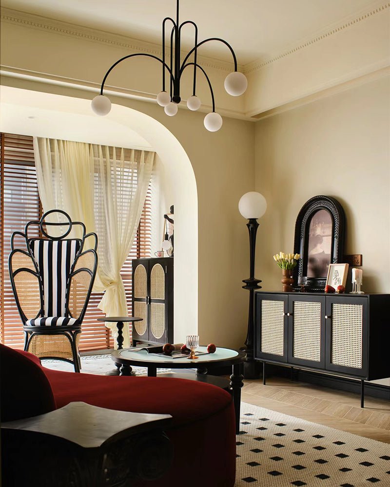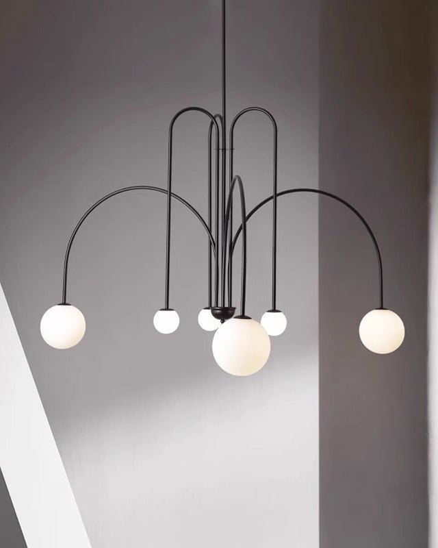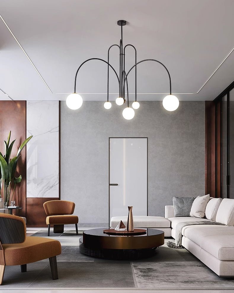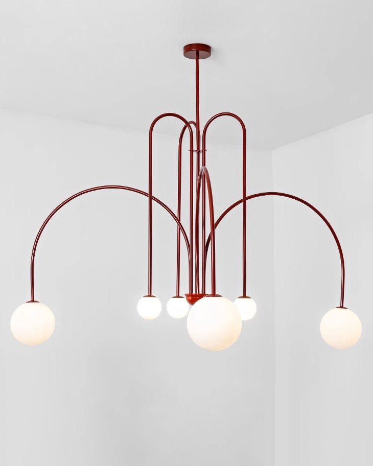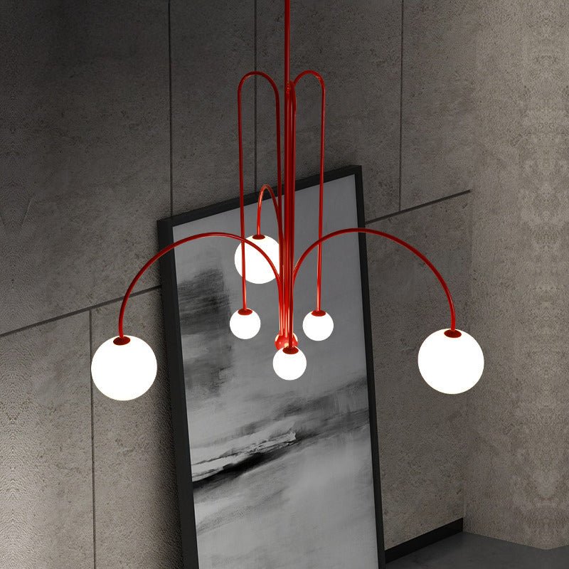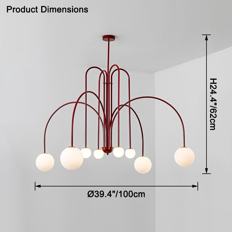 Elevate your living and dining space with the contemporary elegance of the jucci Glass Globe Arm Chandelier. The striking combination of arc arm and finish in red, black or gold accents will add a touch of sophistication to any room. With its unique frosted glass globe design, this chandelier will be a stunning focal point while providing soft, ambient lighting.