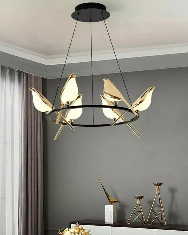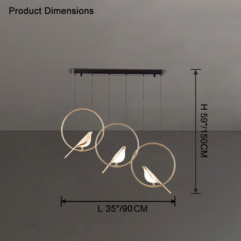 Elevate your home decor with the jucci Gold Bird Chandelier-WM2512a. This modern and elegant piece features three magpies crafted from acrylic and gold, perched on gold circles. Perfect for adding a touch of luxury to your dining room or kitchen.