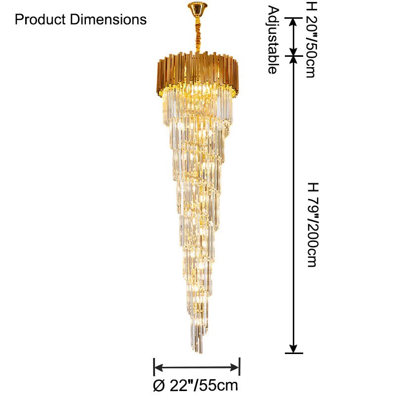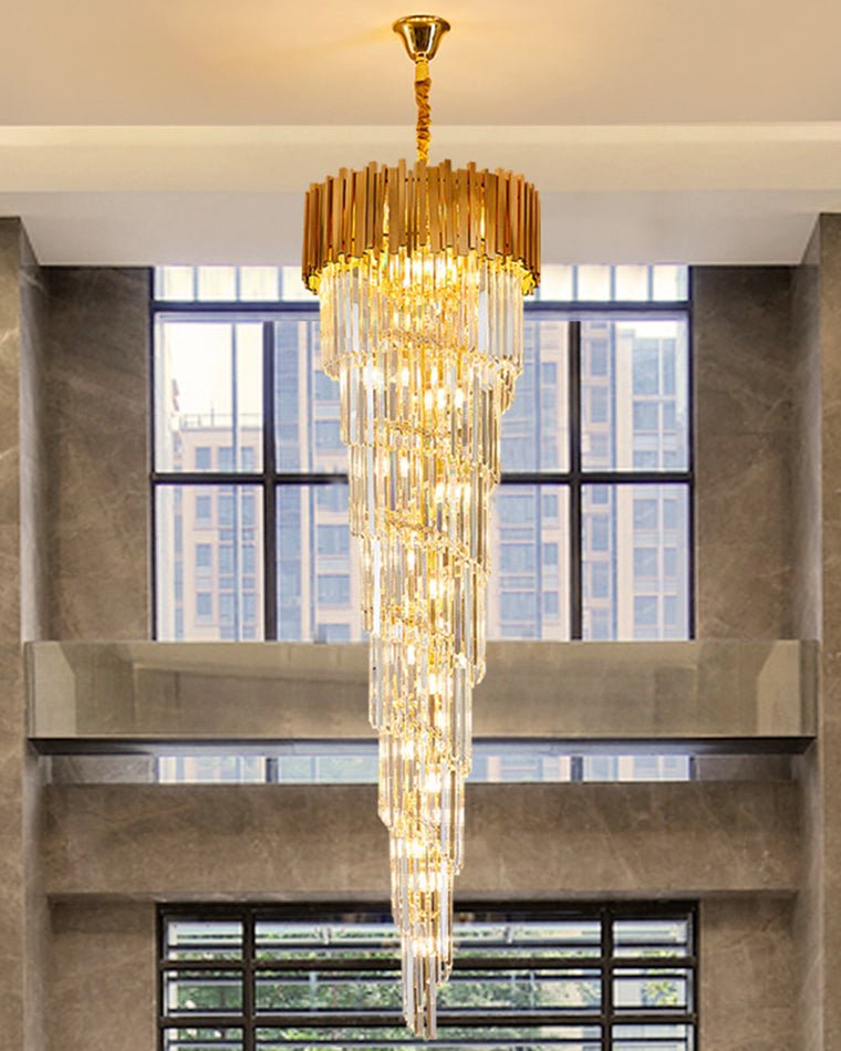 Elevate your space with the opulent and luxurious jucci Gold Cascading Crystal Chandelier. With its staggered panel design and crystal prism accents, this art deco inspired chandelier adds a touch of glamour to any staircase or foyer. Make a statement with this must-have piece of luxury.
