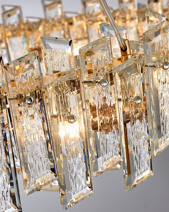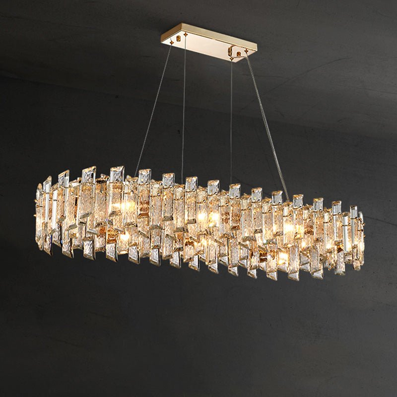 Elevate your dining room with the jucci Gold Crystal Long Oval Chandelier! This art deco inspired fixture features stunning crystal accents and a glamorous gold finish. With its long oval shape, it adds a touch of elegance to any space. Create a luxurious dining experience with this chandelier!