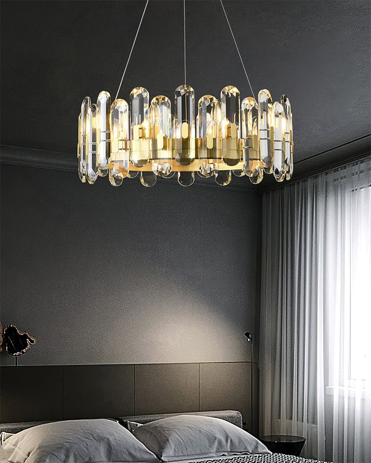 Upgrade your dining or living space with the elegant jucci Gold Crystal Round Chandelier. Made with sparkling crystal and a luxurious gold finish, this chandelier adds a touch of glamour and art deco style to any room. Elevate your home decor with this eye-catching centerpiece!