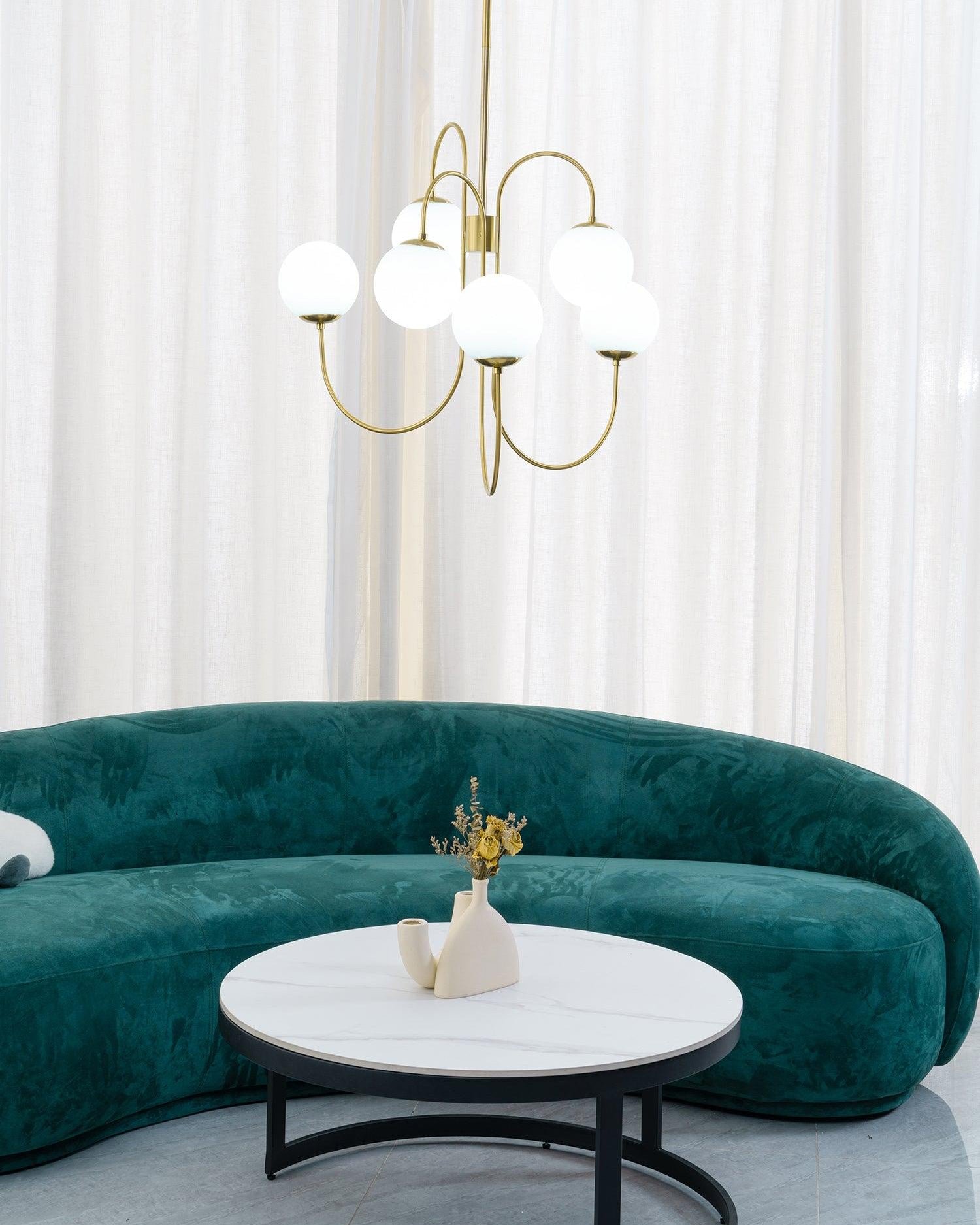 This post-modern chandelier will bring a touch of luxury to your living room. The elegant gold finish and swoop arm design give it a unique and modern look. Made with glass globes, it will add a touch of sophistication to any space. Elevate your home decor with the jucci Gold Globe Arm Chandelier!