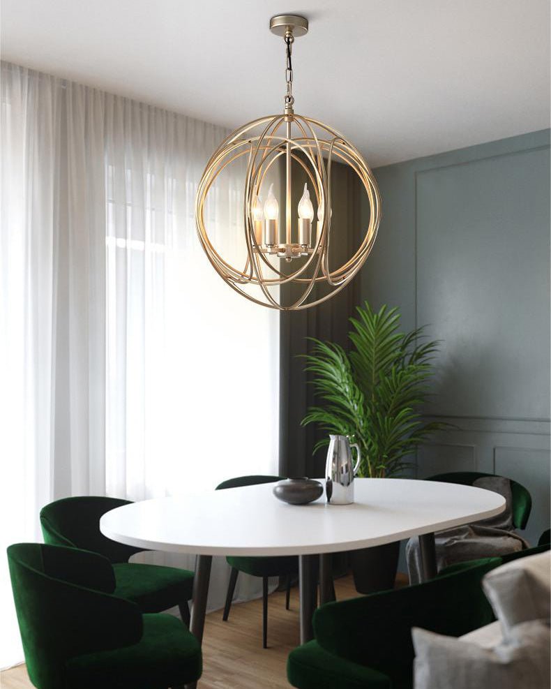 Transform your dining room or kitchen into a modern farmhouse dream with the jucci Gold Orb Cage Chandelier. Made of sleek metal and featuring a unique globe design, this pendant light will add a touch of sophistication to any space. The warm gold finish and candle-inspired design create a cozy and inviting atmosphere that is perfect for entertaining or enjoying a quiet evening at home. Elevate your home decor with this elegant and stylish pendant light.