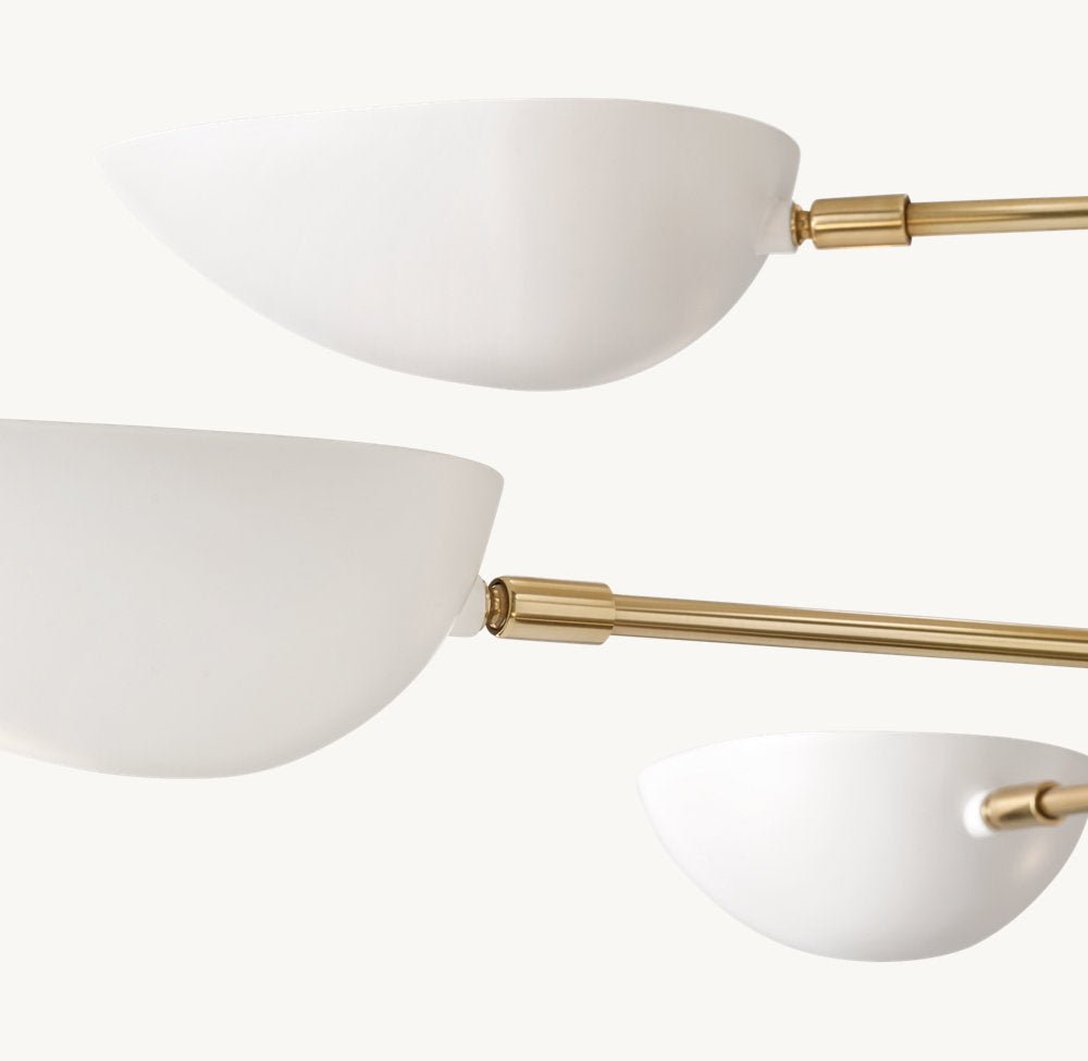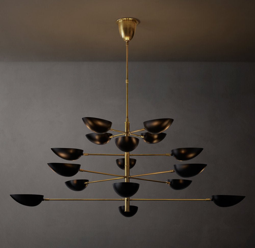 Designer Aerin Lauder of New York redefines modern grandeur with Graphic, featuring an array of sixteen cup shades that shine light upwards to create a beautiful reflection from the ceiling. Composed in concentric tiers, powdercoated steel arms in a hand-rubbed antique brass finish rotate from a central axis for a dramatic, sculptural effect.