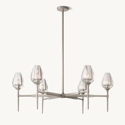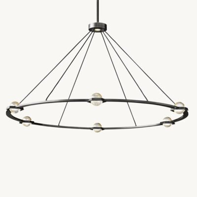 Inspired by a German chandelier from the 1970s, our fixture evokes the boldness and glamour of the era. Designed by Timothy Oulton, a band of faceted crystal glass prisms reflects and refracts the light, capturing the essence of emerald-cut diamonds.