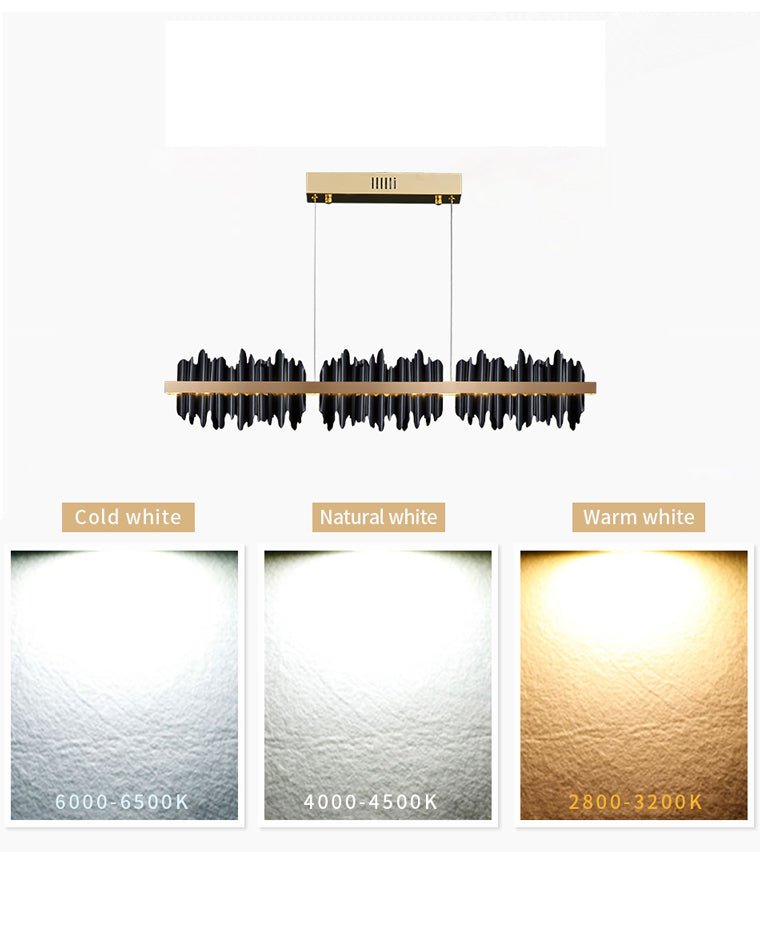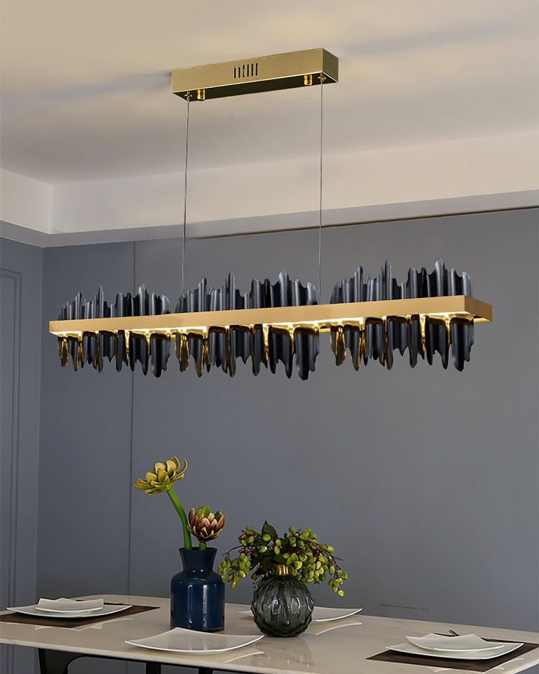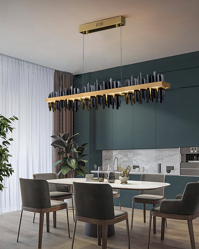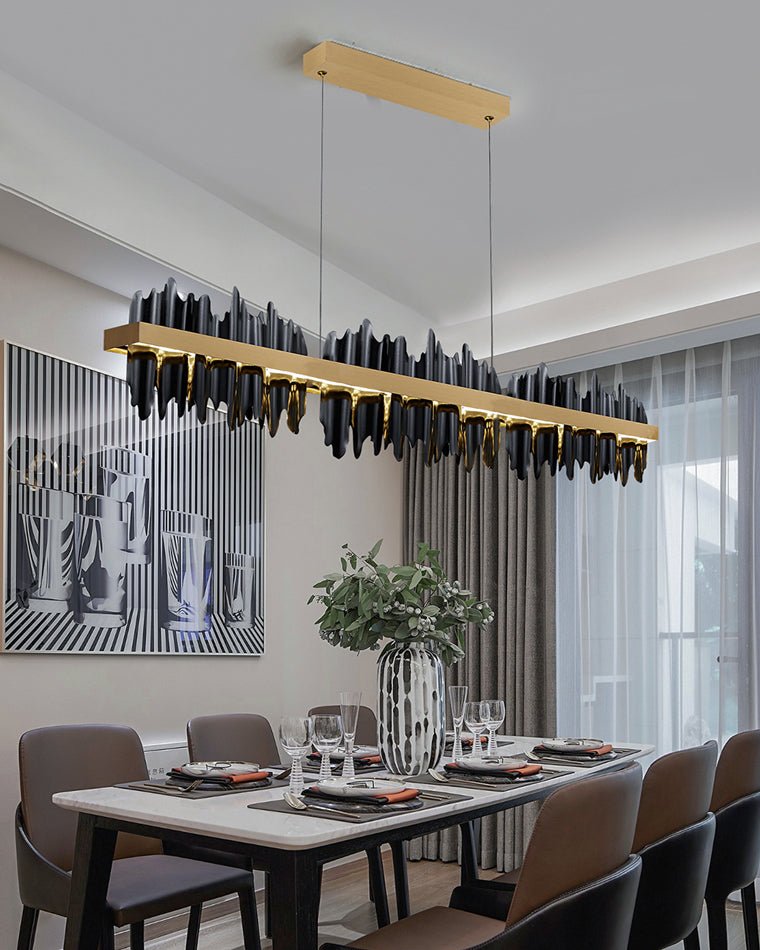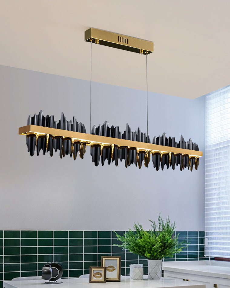 Upgrade your dining experience with this stunning and contemporary lighting fixture. The Iceberg Design LED Chandelier combines sleek lines with a touch of luxury, creating an eye-catching focal point in any dining room or kitchen island setting. This stunning chandelier has irregular borders, mimicking the beauty of glowing icicles, and is a perfect complement to spaces that require linear lighting. The black iron body of the study contrasts with polished stainless steel bars, and the modern juxtaposition is just right.