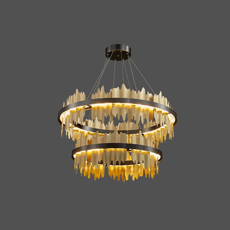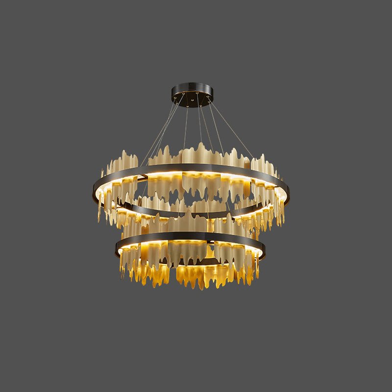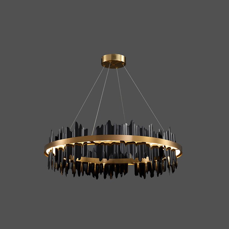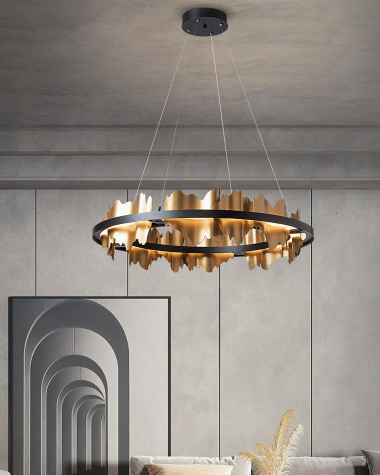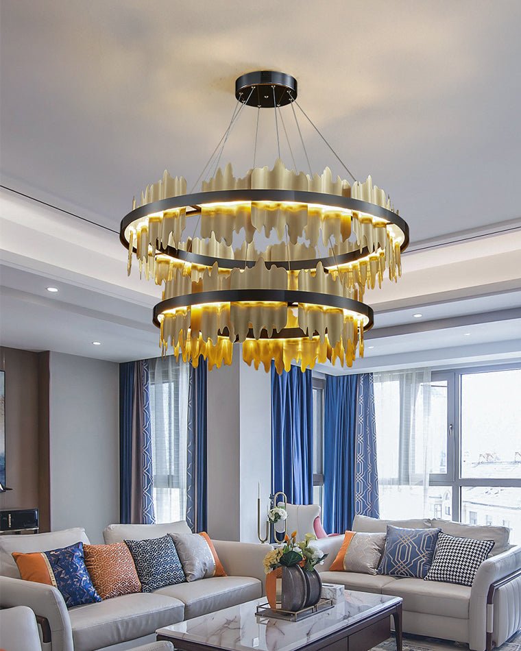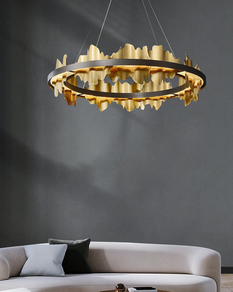 These chandeliers feature an artistic, sculptural design with cascading, irregular metal elements reminiscent of an iceberg. The light has a bold contrast of black and gold, creating a dramatic, modern-industrial aesthetic. With its golden finish and double-tier structure, it exudes luxury and elegance, making it a statement piece for high-end interiors. Both designs work well in living rooms, dining areas, or grand entryways, adding a sophisticated yet artistic touch to home decor.