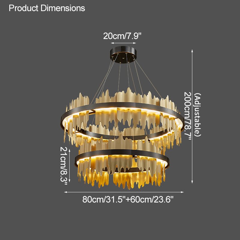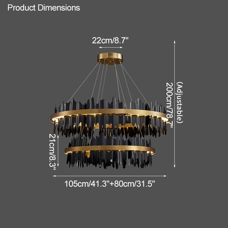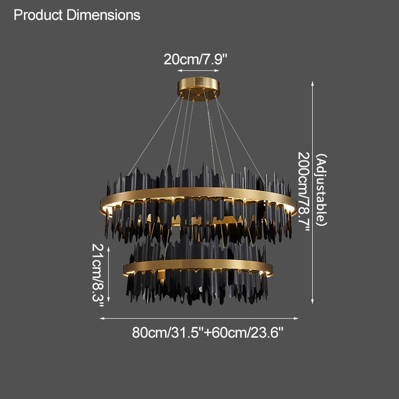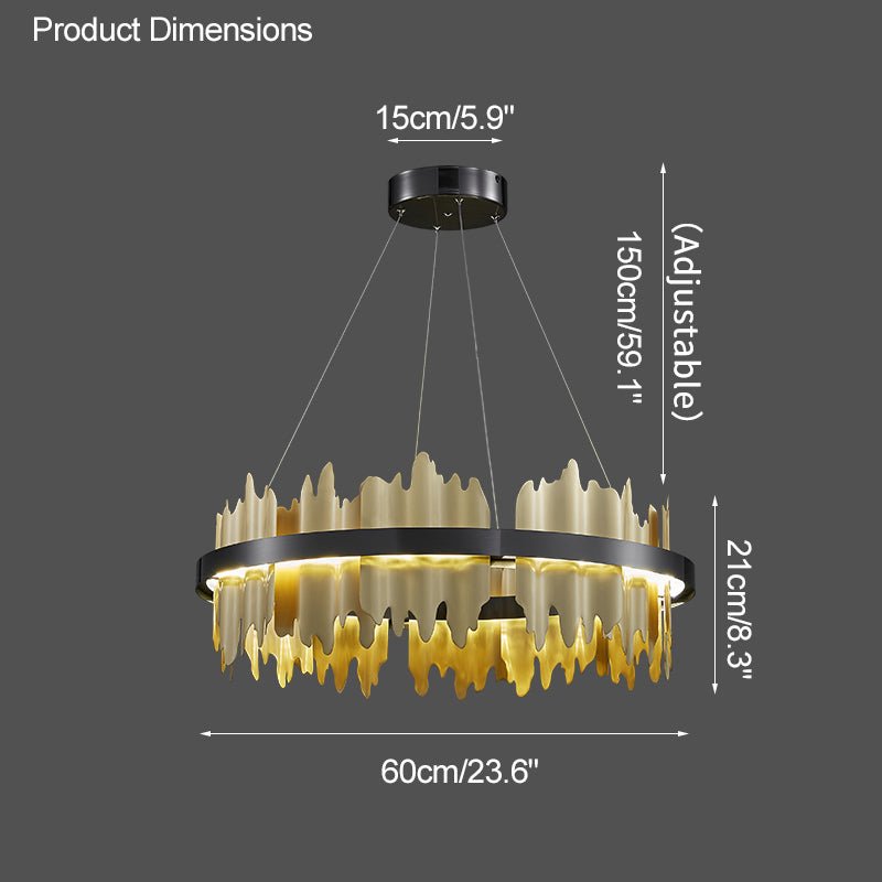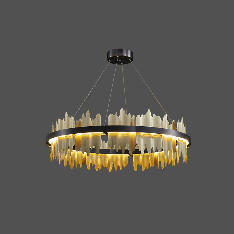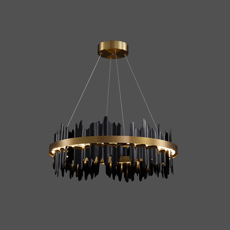 These chandeliers feature an artistic, sculptural design with cascading, irregular metal elements reminiscent of an iceberg. The light has a bold contrast of black and gold, creating a dramatic, modern-industrial aesthetic. With its golden finish and double-tier structure, it exudes luxury and elegance, making it a statement piece for high-end interiors. Both designs work well in living rooms, dining areas, or grand entryways, adding a sophisticated yet artistic touch to home decor.