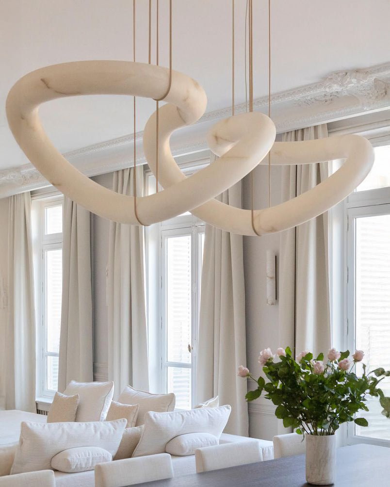 Elevate your living or dining room with the sleek and modern jucci Infinity Alabaster Chandelier-WM2886. The contemporary design and use of alabaster add a touch of luxury to any space. Transform your home with this statement piece and create a warm and inviting atmosphere for your next gathering.