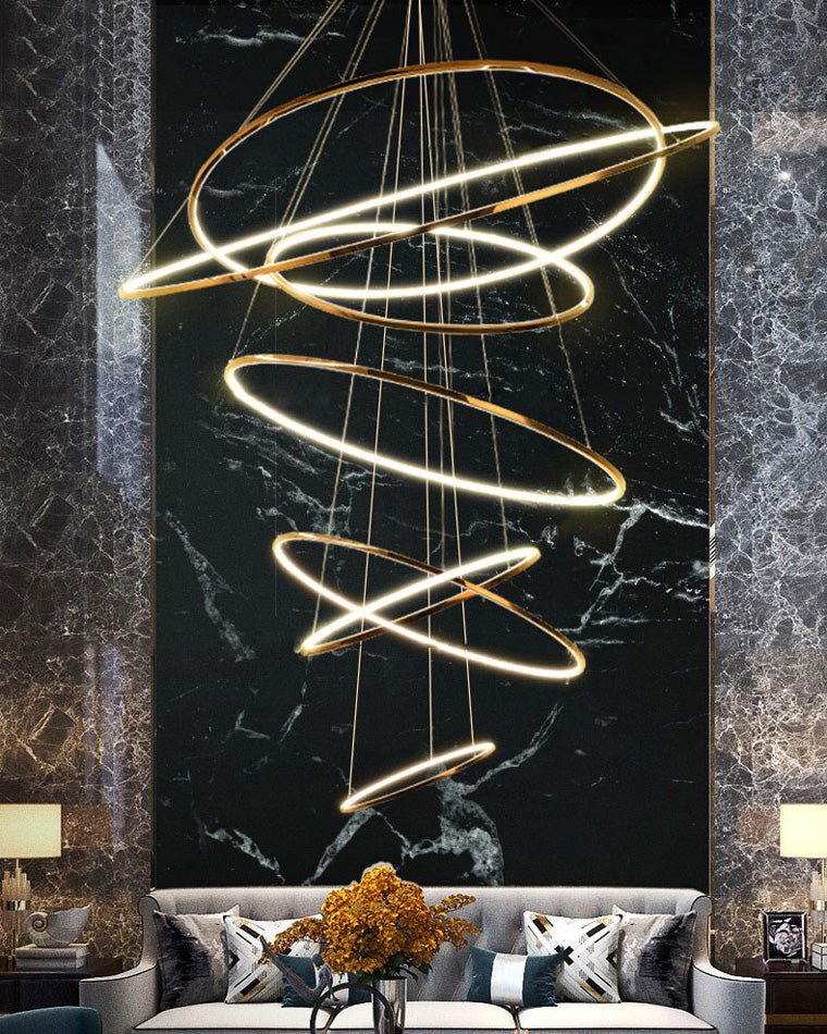 Elevate your foyer or staircase with the jucci Large Tiered Ring LED Chandelier. Crafted from stainless steel, its multiple tiers design features a luxurious gold ring integrated with LED. Enhance your space with minimalist grandeur and create a stunning first impression.