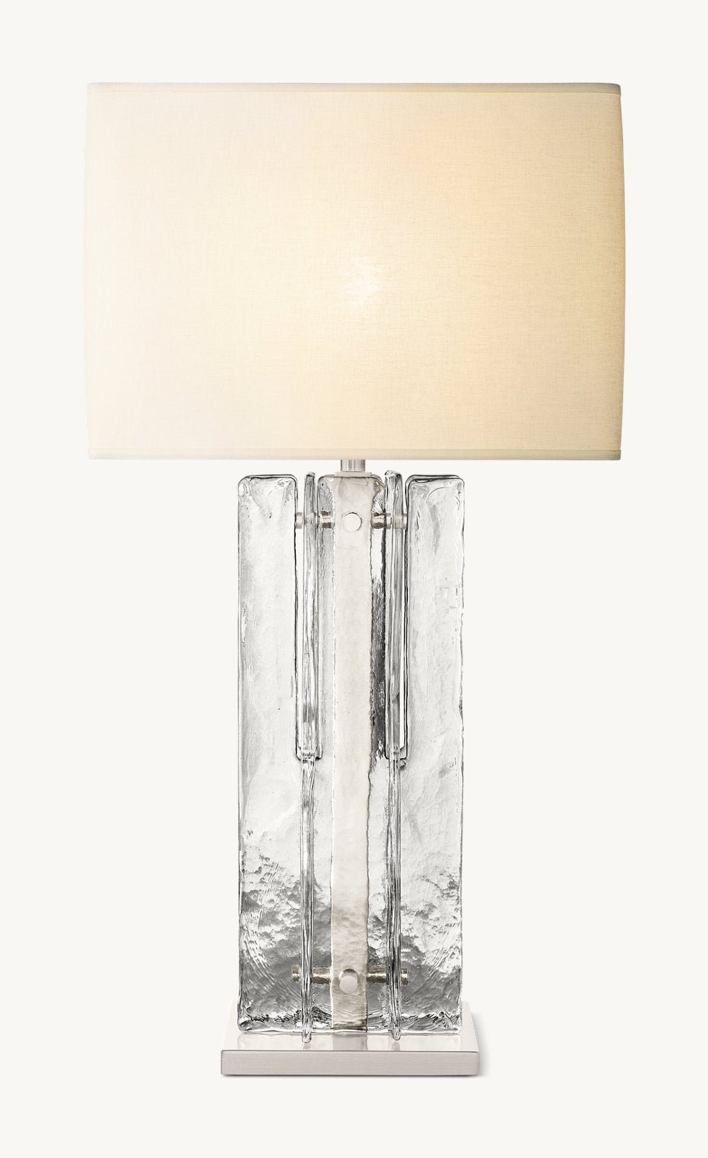 Crafted of solid cast glass, our Lattice collection’s interlocking planes recall the geometric precision of the midcentury International Style. A study in repetition and rhythm, the linear form employs open space to lend a weightless feel. Gently rounded corners on the fluid, rippled panes subtly soften the outline, while a linen drum shade diffuses the light within.