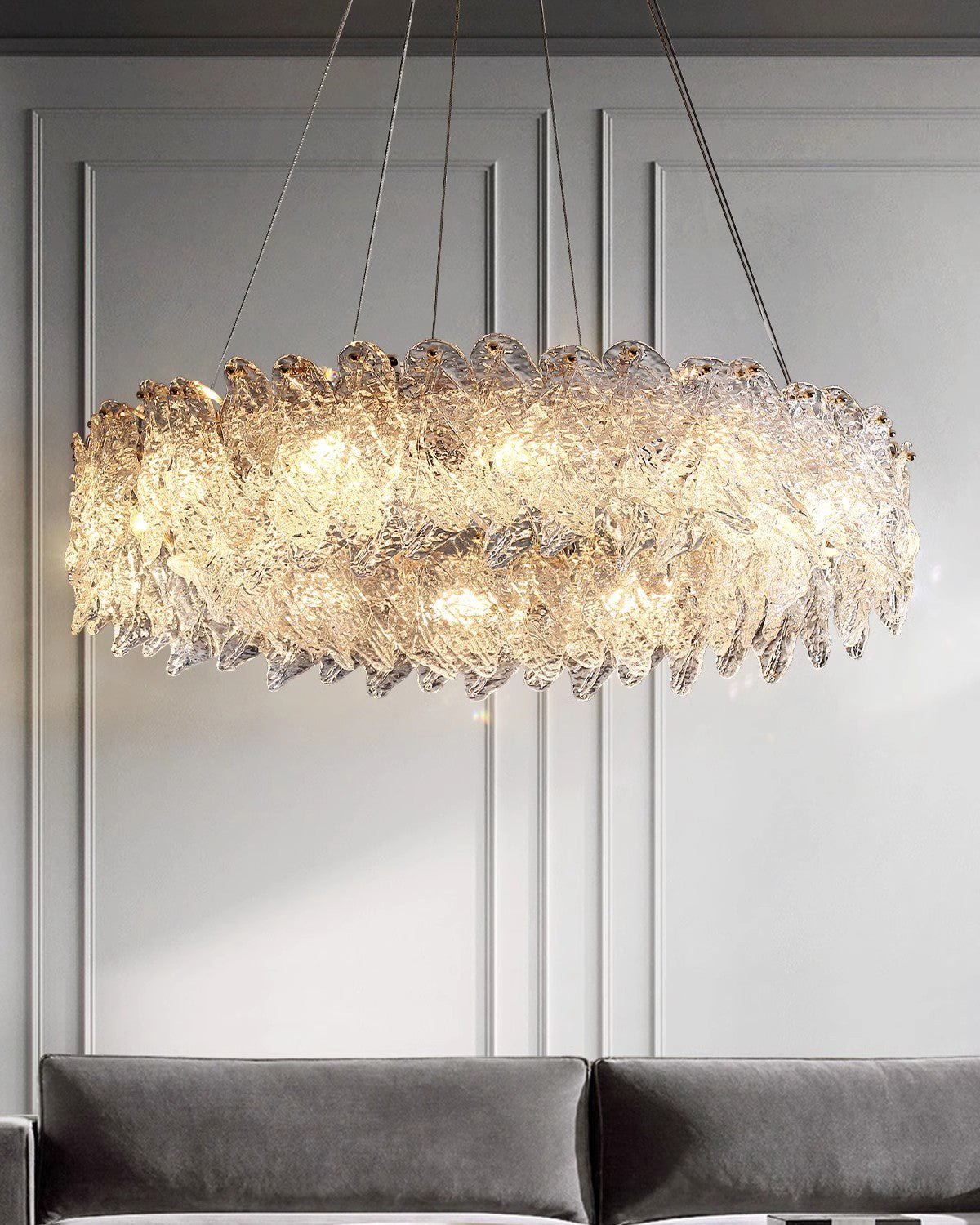 Add a touch of elegance to your space with the jucci Leaf Glass Chandelier. Featuring a gold finish and textured glass, this chandelier will bring a contemporary feel to any dining room, living room, or bedroom. Its unique round and linear design will make a stunning statement piece.