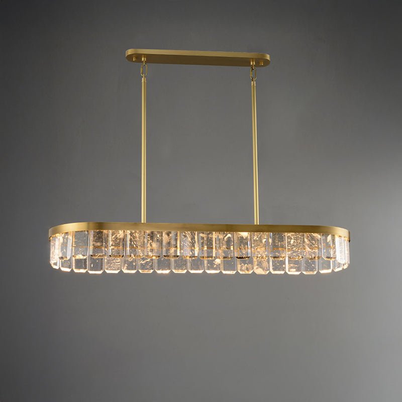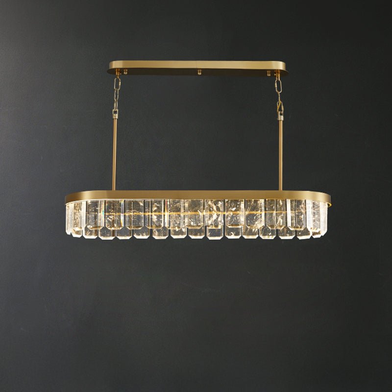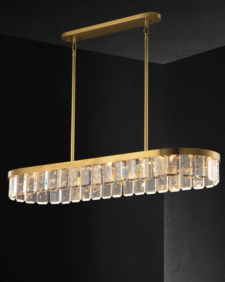 Elevate your dining room with our contemporary jucci Linear Crystal Chandelier-WM2540. Featuring stunning crystal accents atop a sleek long oval frame, this gold chandelier is sure to add a touch of elegance and sophistication to any space. Transform your dining experience with this luxurious addition.