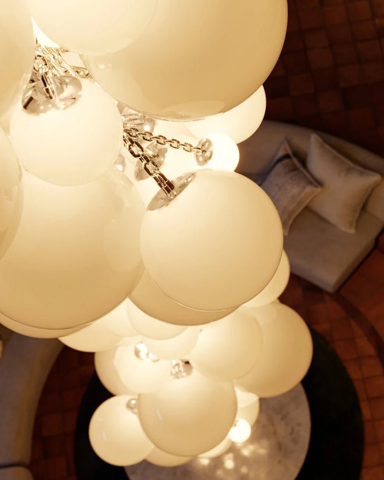 Elevate your foyer or staircase with the modern and elegant jucci Long Glass Bubble Chandelier. The delicate glass bubbles create a dreamy atmosphere, while the white grape-inspired design adds a touch of sophistication. Perfect for those who appreciate contemporary interior design.
