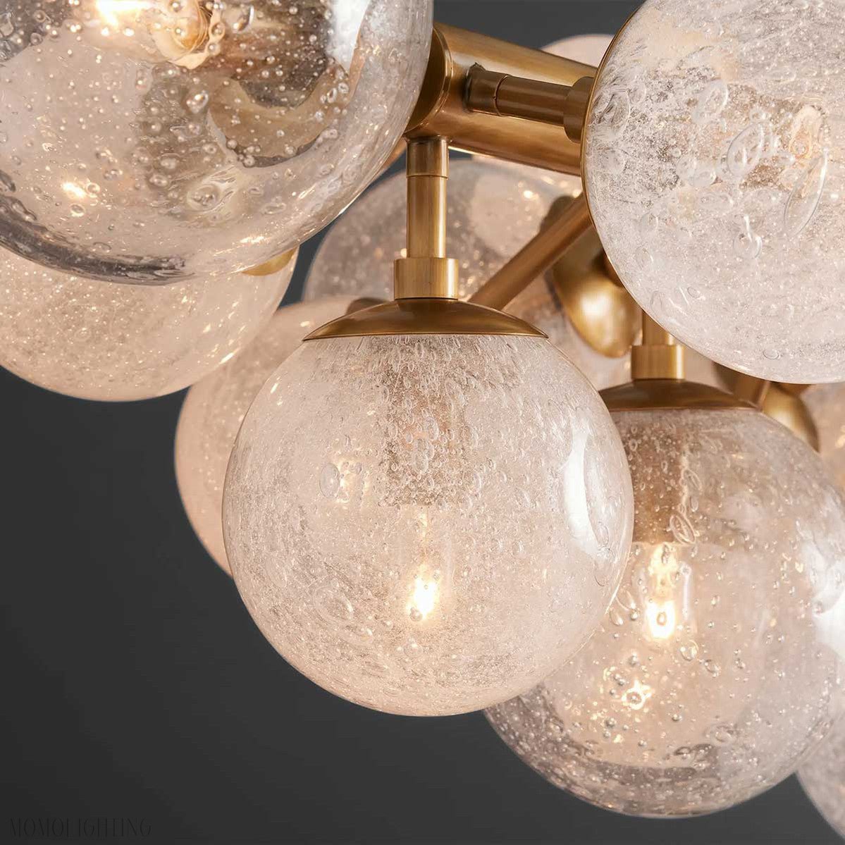 A fusion of rustic charm and industrial design, our Mandoza Collection features stunning silhouettes and mixed-material style. Each individual glass globe is hand-blown with a reactive technique, creating a dense network of bubbles under a thick layer of glass. The result has a striking effect when illuminated from within, casting light from every angle.