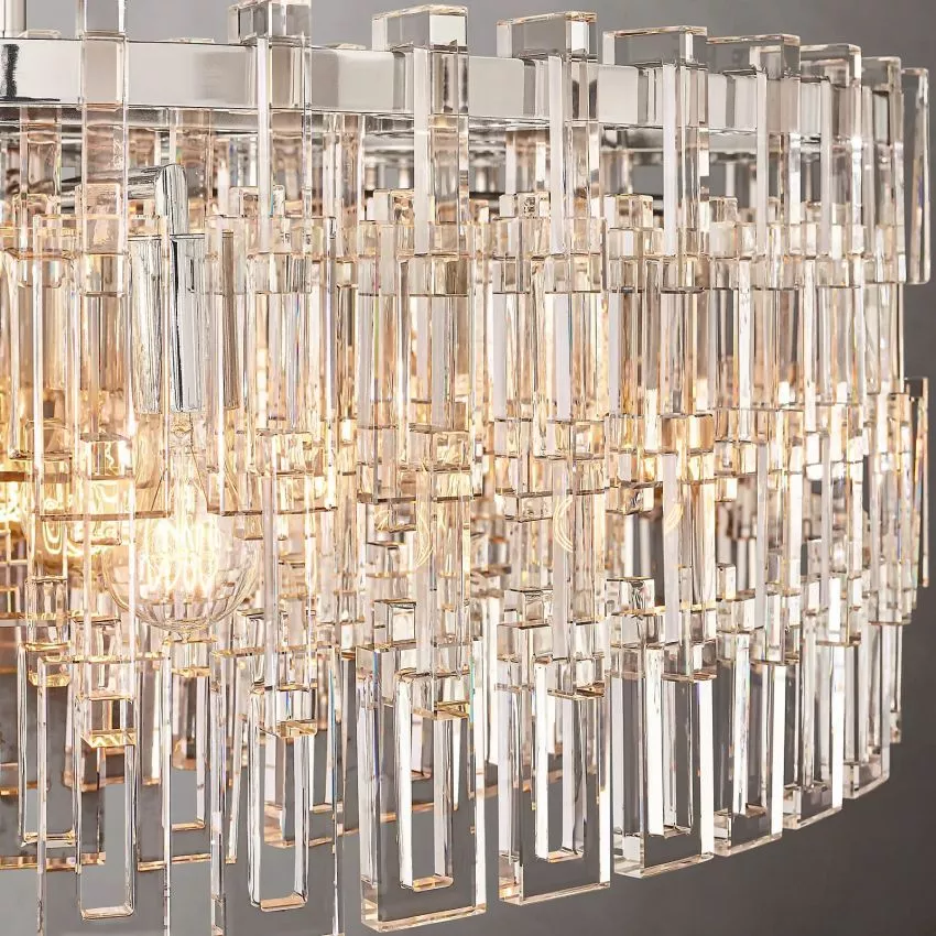 | The chandelier is made of sand cast brass and K9 glass, a crystal used to make optical lenses and prisms. Connected with the O-shaped crystal. Inspired by industrial metal chains, it reimagines staggered open and closed links with amazing crystal glass. The pure, simple and stylized chain link is made of more than 600 crystals without wire suspension, creating a bright cascade and shining light. |